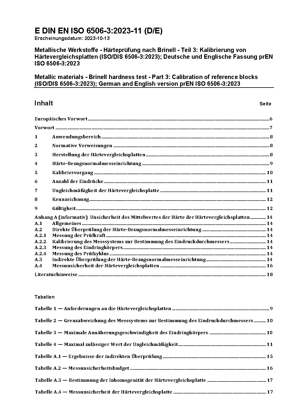 Metallische Werkstoffe - Härteprüfung nach Brinell - Teil 3: Kalibrierung von Härtevergleichsplatten (ISO/DIS 6506-3:2023); Deutsche und Englische Fassung prEN ISO 6506-3:2023
