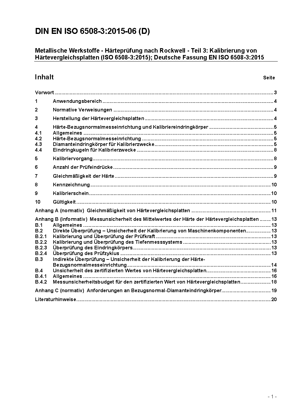 Metallic materials - Rockwell hardness test - Part 3: Calibration of reference blocks (scales A, B, C, D, E, F, G, H, K, N, T) (ISO 6508-3:2005); German version EN ISO 6508-3:2005