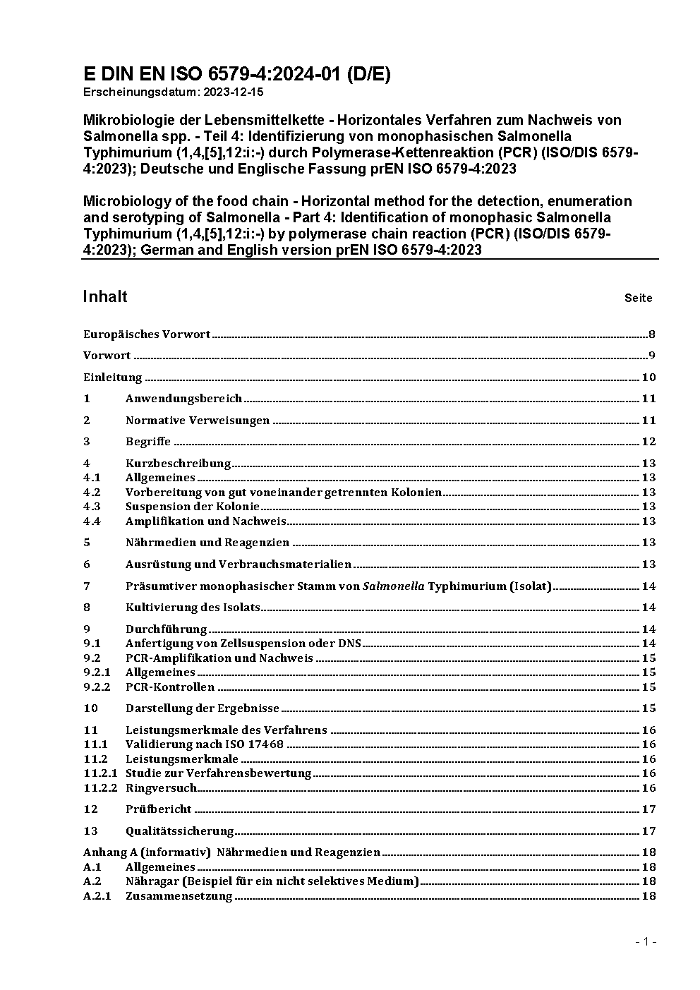 Microbiology of the food chain - Horizontal method for the detection, enumeration and serotyping of Salmonella - Part 4: Identification of monophasic Salmonella Typhimurium (1,4,[5],12:i:-) by polymerase chain reaction (PCR) (ISO/DIS 6579-4:2023); German and English version prEN ISO 6579-4:2023