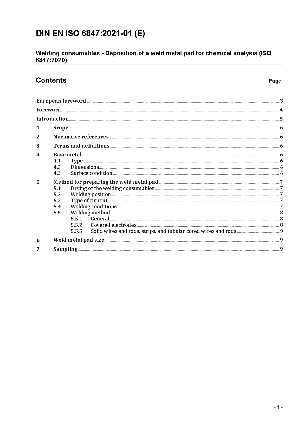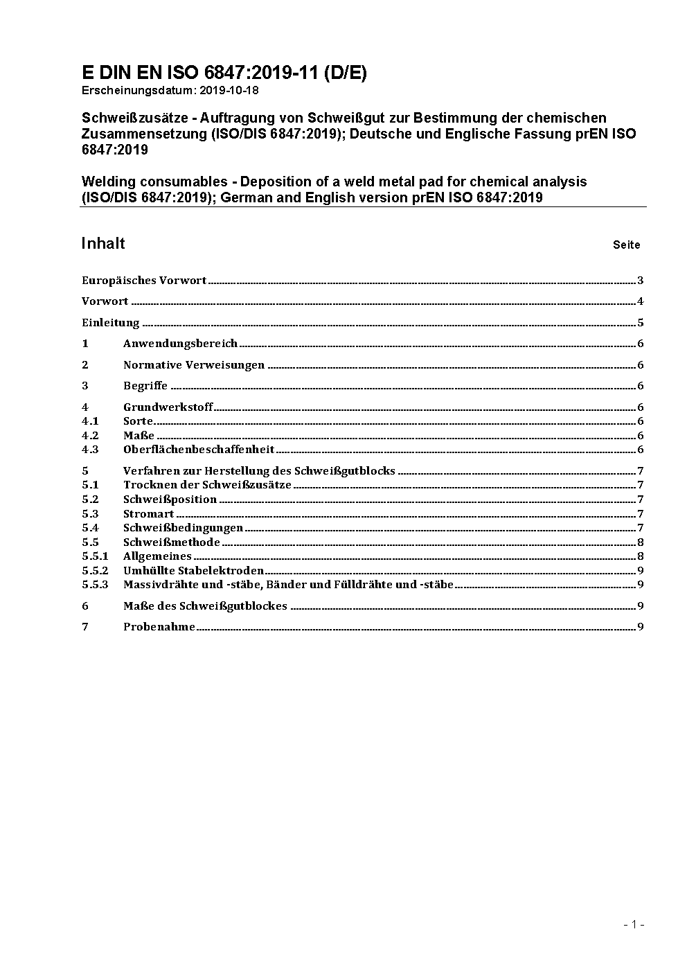 Welding consumables - Deposition of a weld metal pad for chemical analysis (ISO 6847:2000); German version EN ISO 6847:2001
