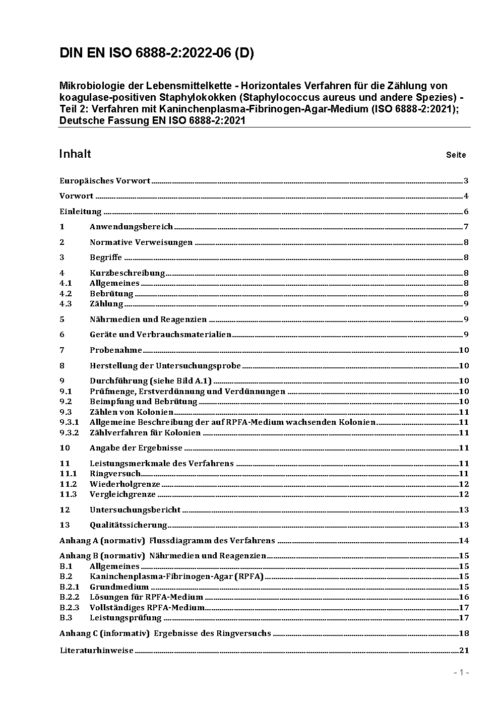 Microbiology of food and animal feeding stuffs - Horizontal method for the enumeration of coagulase-positive staphylococci (Staphylococcus aureus and other species) - Part 2: Technique using rabbit plasma fibrinogen agar medium (ISO 6888-2:1999 + AMD 1:2003); German version EN ISO 6888-2:1999 + A1:2003