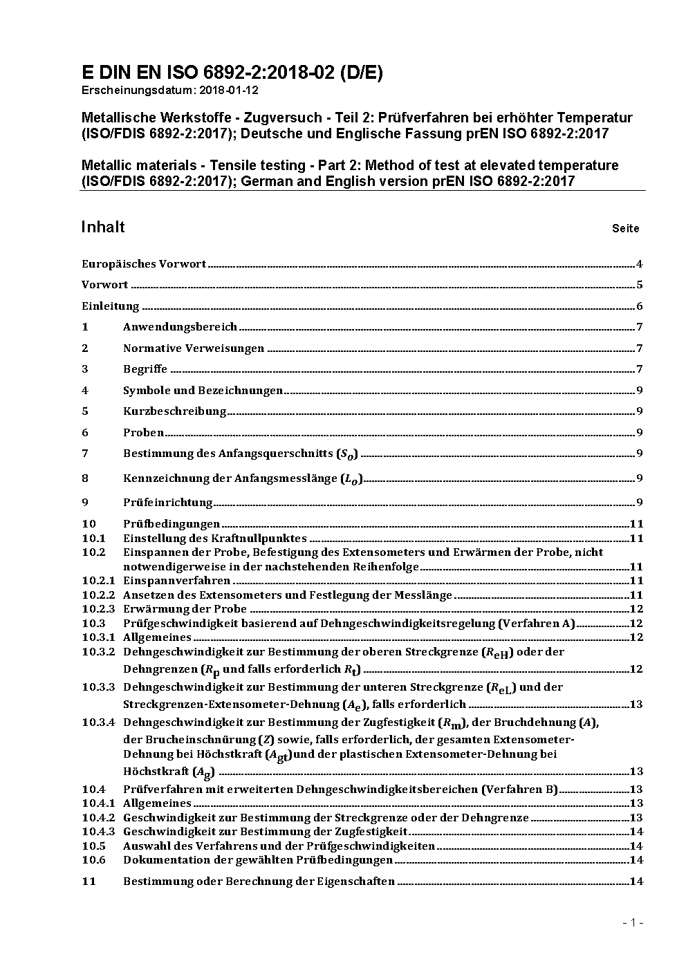 Metallische Werkstoffe - Zugversuch - Teil 2: Prüfverfahren bei erhöhter Temperatur (ISO/DIS 6892-2:2009); Deutsche Fassung prEN ISO 6892-2:2009