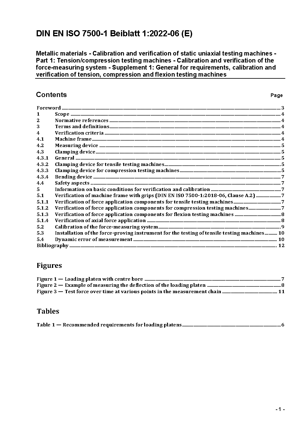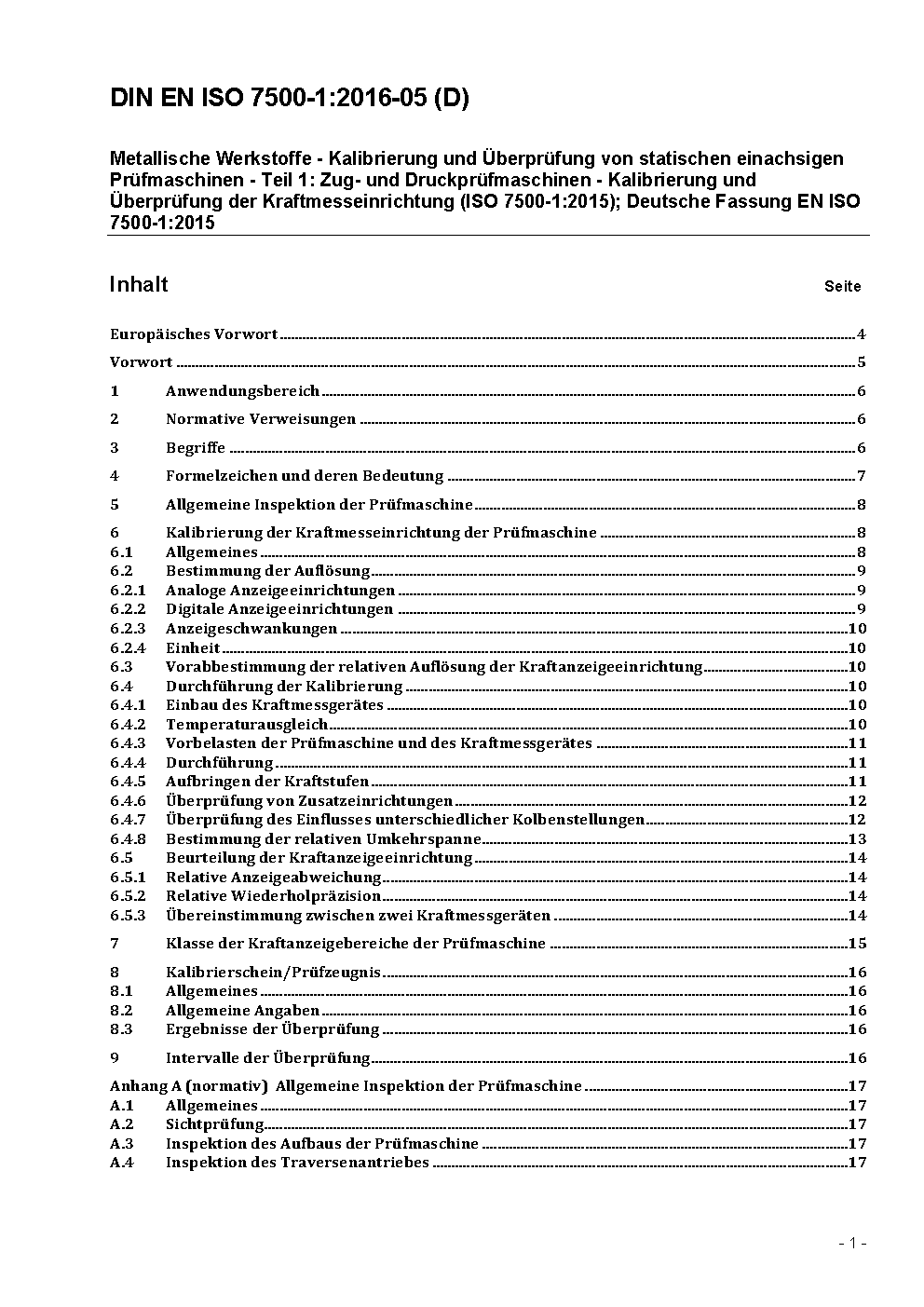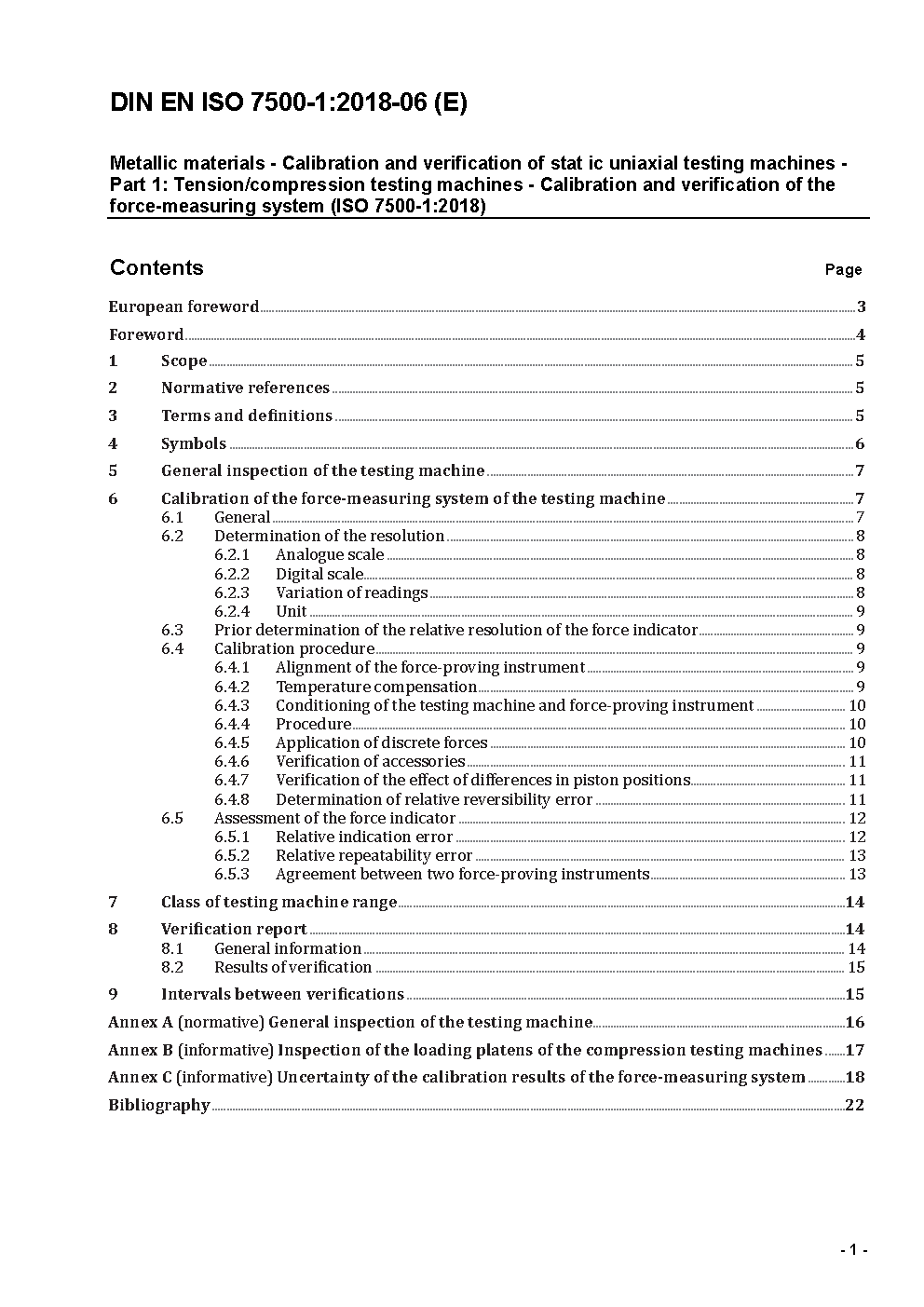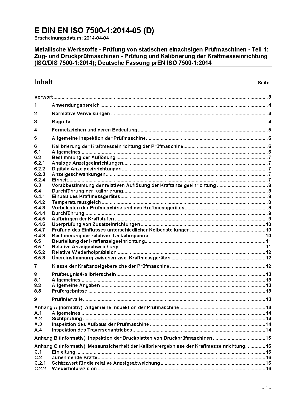 Metallic materials - Verification of static uniaxial testing machines - Part 1: Tension/compression testing machines - Verification and calibration of the force-measuring system (ISO 7500-1:2004); German version EN ISO 7500-1:2004