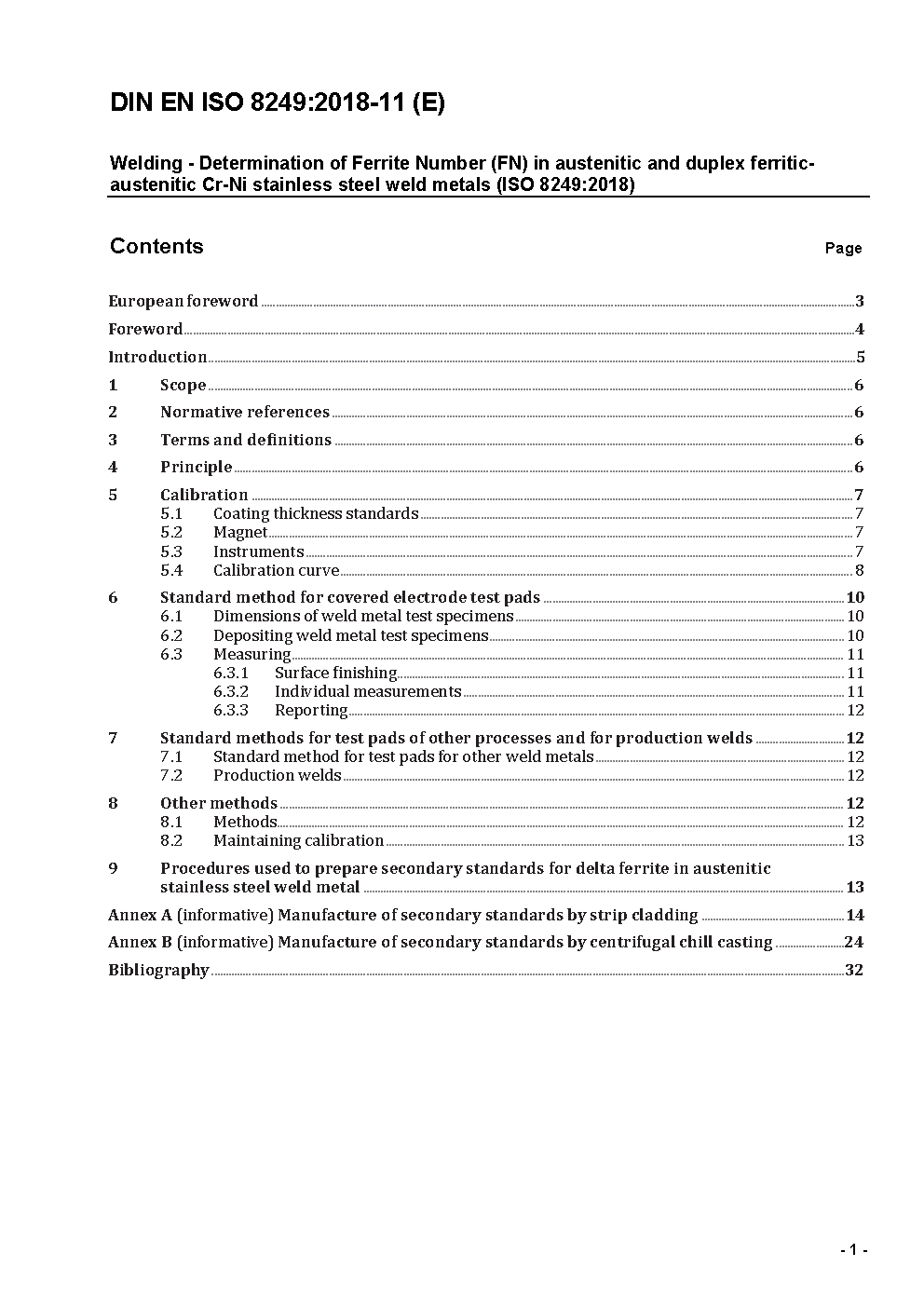 This standard specifies the method and apparatus for - the measurement of the delta ferrite content in largely austenitic and duplex ferritic-austenitic steel weld metal; - the preparation and measurement of standard pads for manual metal arc covered electrodes; - the calibration of other instruments to measure FN.