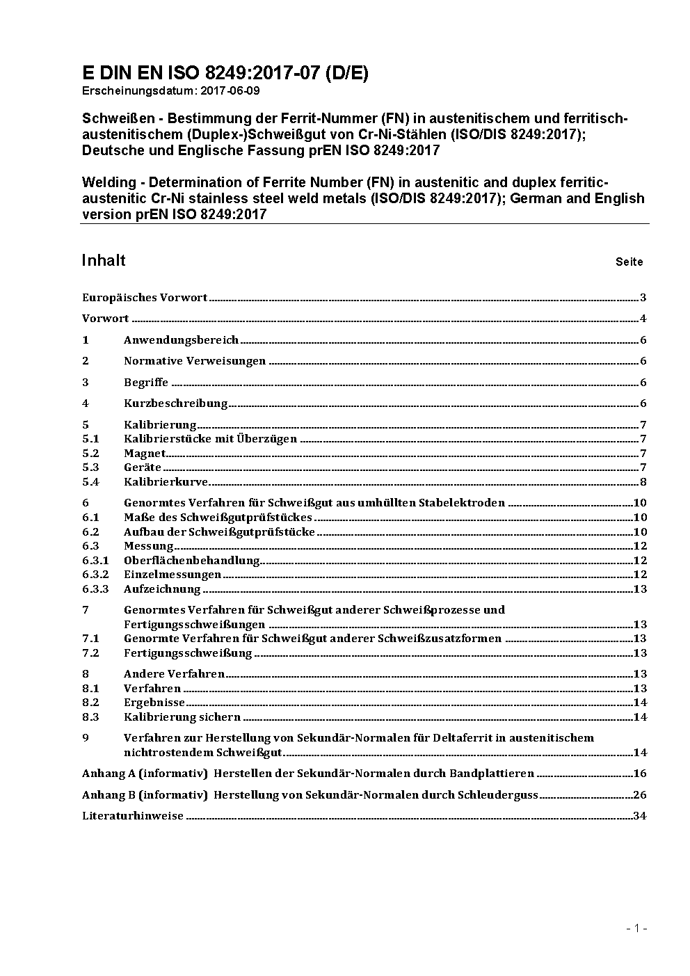 Welding - Determination of Ferrite Number (FN) in austenitic and duplex ferritic-austenitic Cr-Ni stainless steel weld metals (ISO/DIS 8249:2017); German and English version prEN ISO 8249:2017
