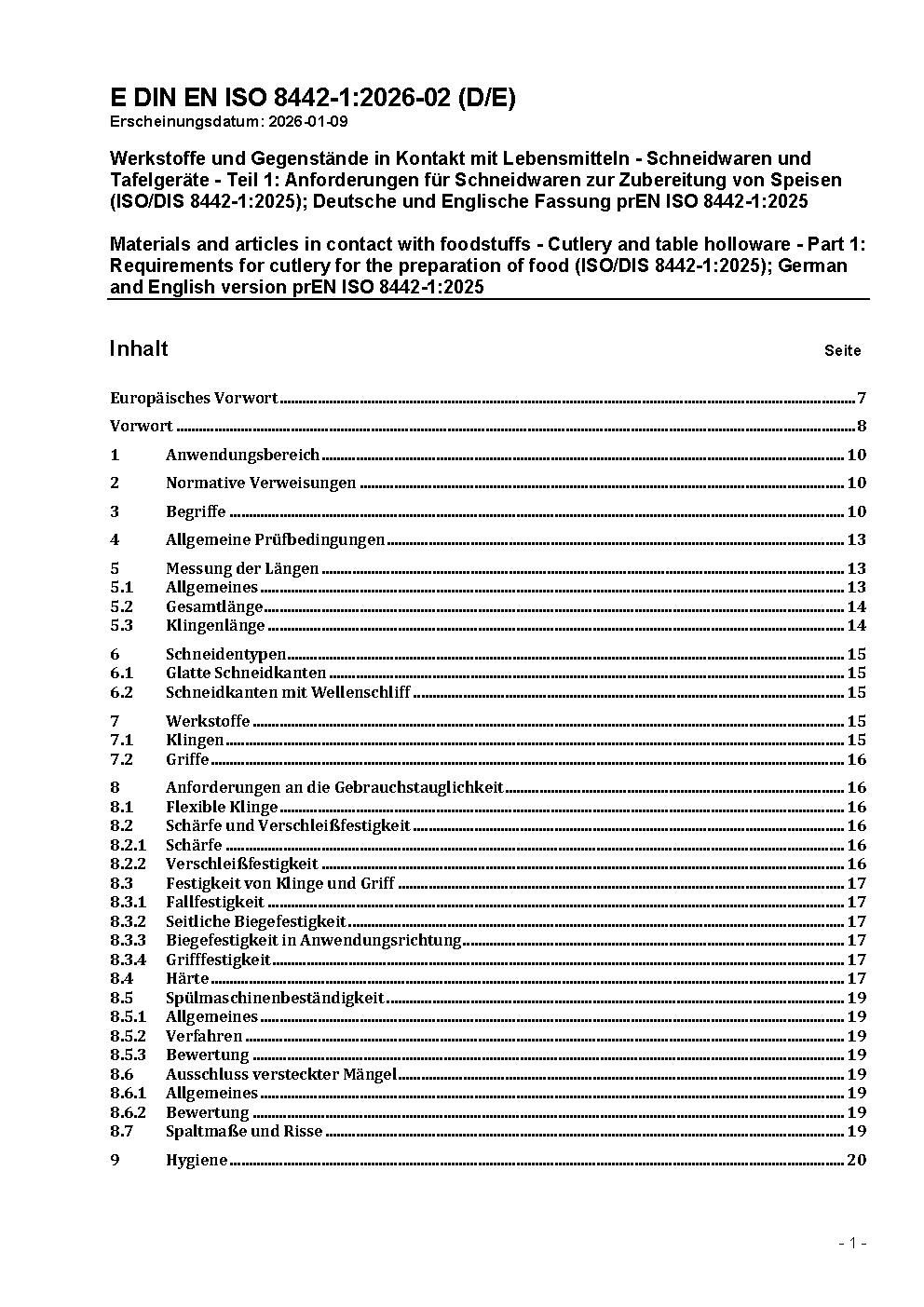 Werkstoffe und Gegenstände in Kontakt mit Lebensmitteln - Schneidwaren und Tafelgeräte - Teil 1: Anforderungen für Schneidwaren zur Zubereitung von Speisen (ISO 8442-1:1997); Deutsche Fassung EN ISO 8442-1:1997