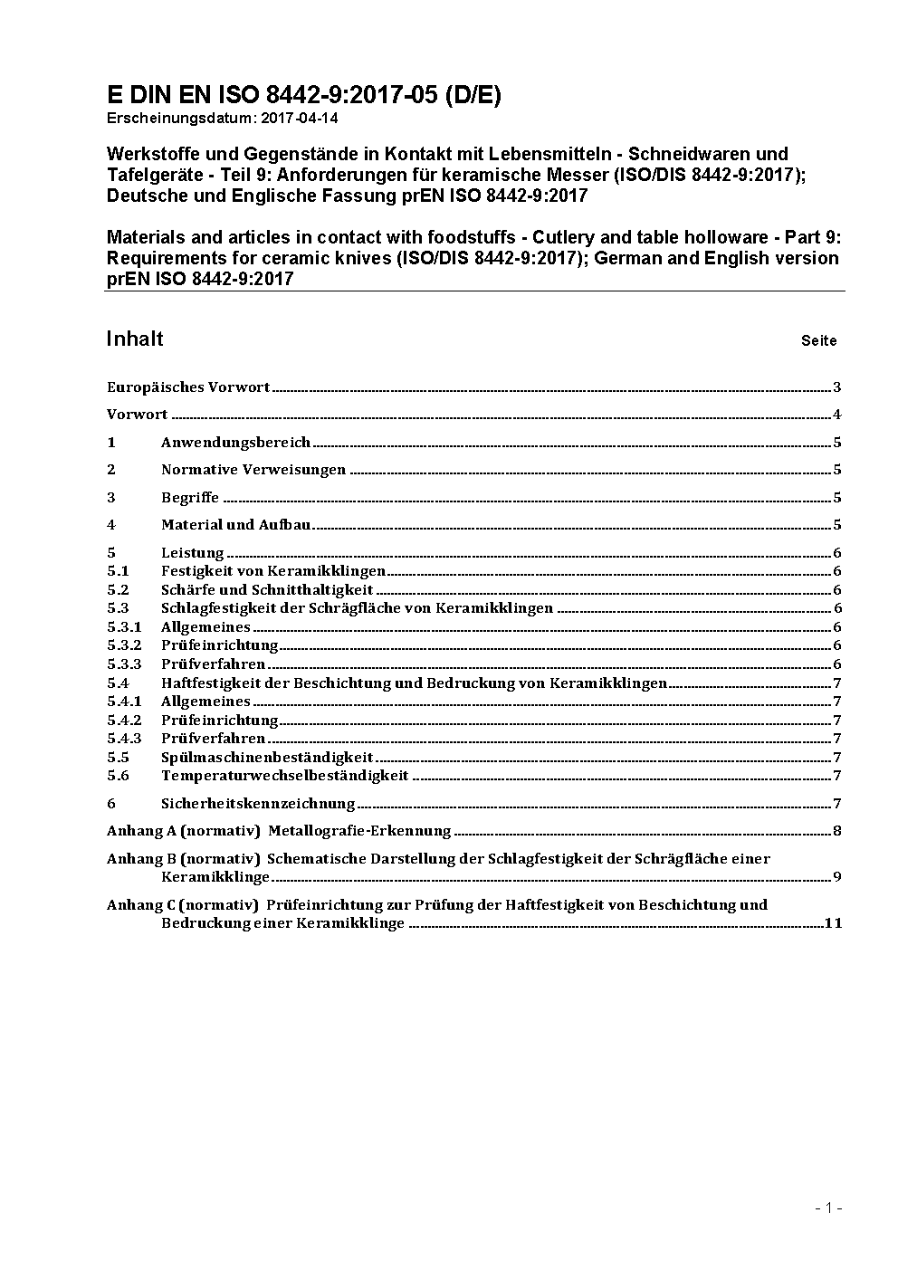 Materials and articles in contact with foodstuffs - Cutlery and table holloware - Part 9: Requirements for ceramic knives (ISO 8442-9:2018); German version EN ISO 8442-9:2018