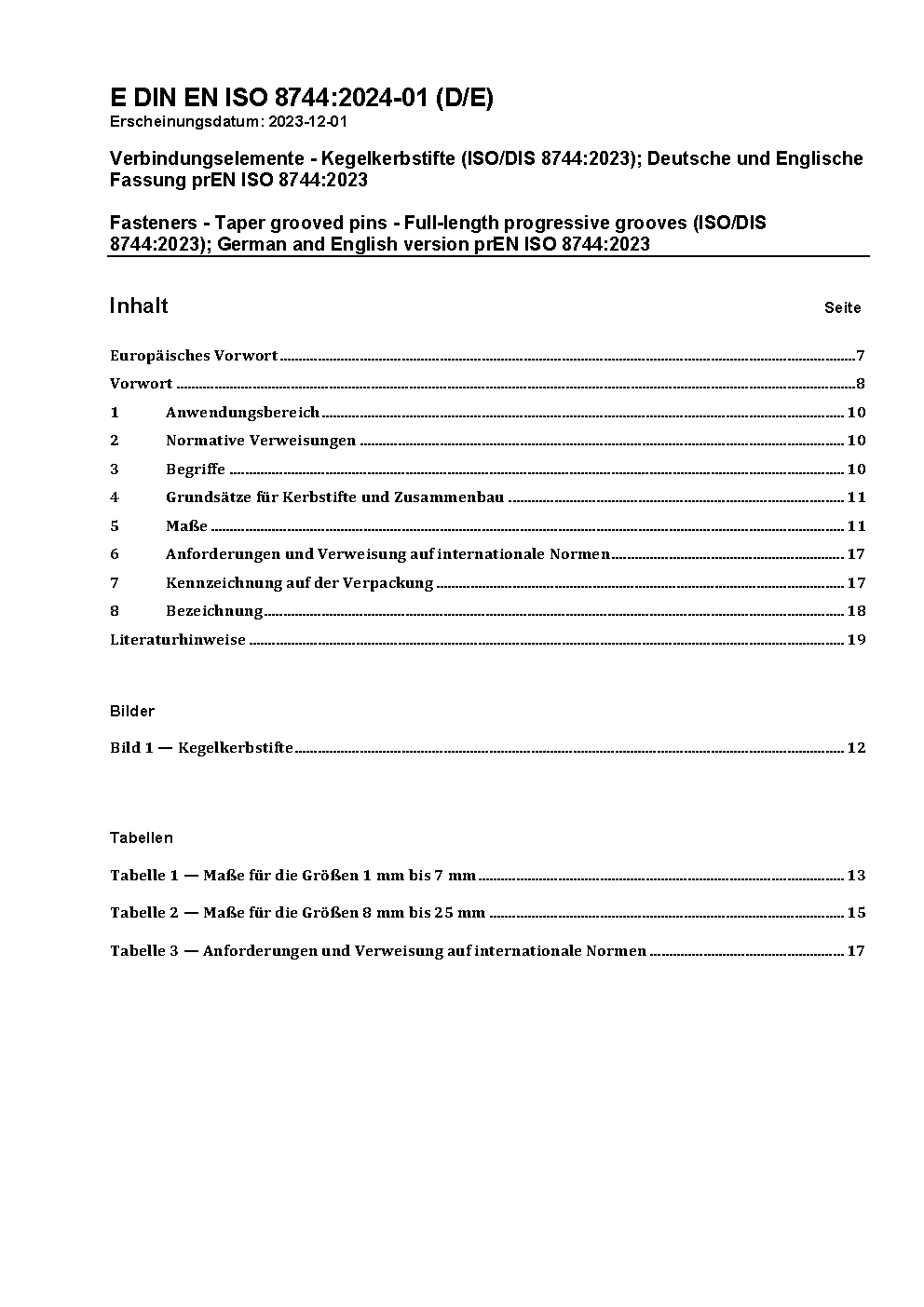 Fasteners - Taper grooved pins - Full-length progressive grooves (ISO/DIS 8744:2023); German and English version prEN ISO 8744:2023