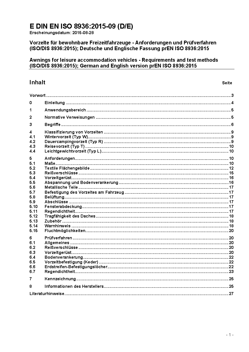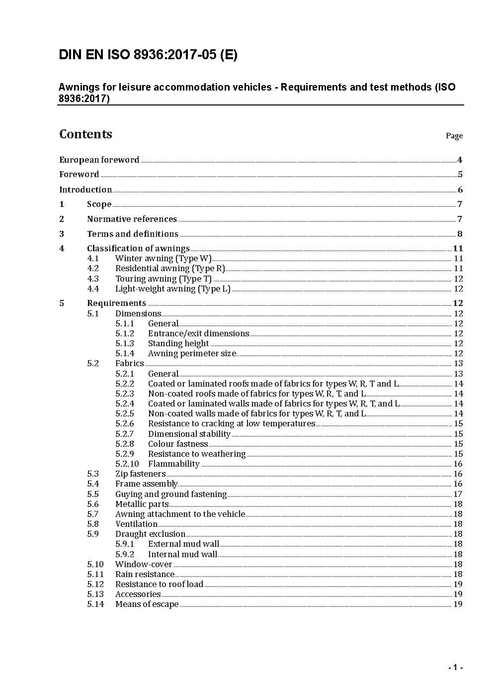 Awnings for leisure accommodation vehicles - Requirements and test methods (ISO 8936:2017); German version EN ISO 8936:2017