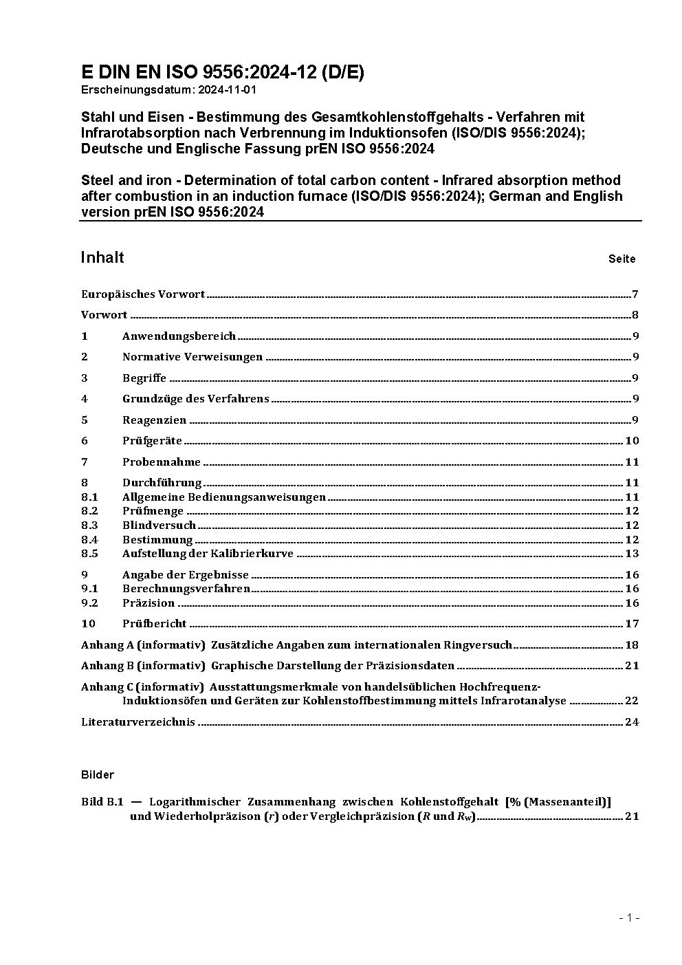 The document specifies an infrared absorption method after combustion in an induction furnace for the determination of total carbon content in steel and iron. The method is applicable to carbon contents between 0,003 % (m/m) and 4,5 % (m/m).