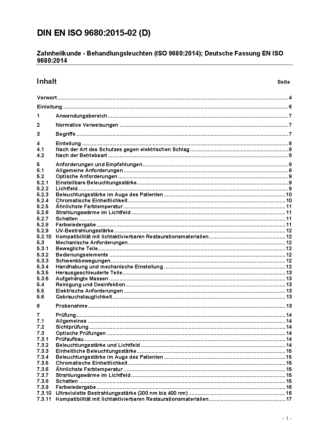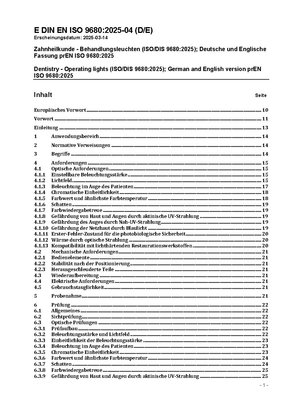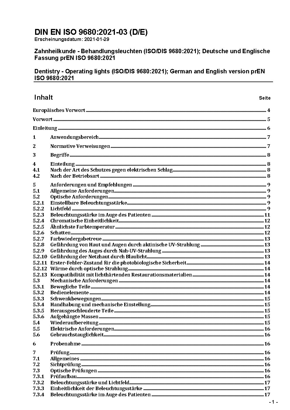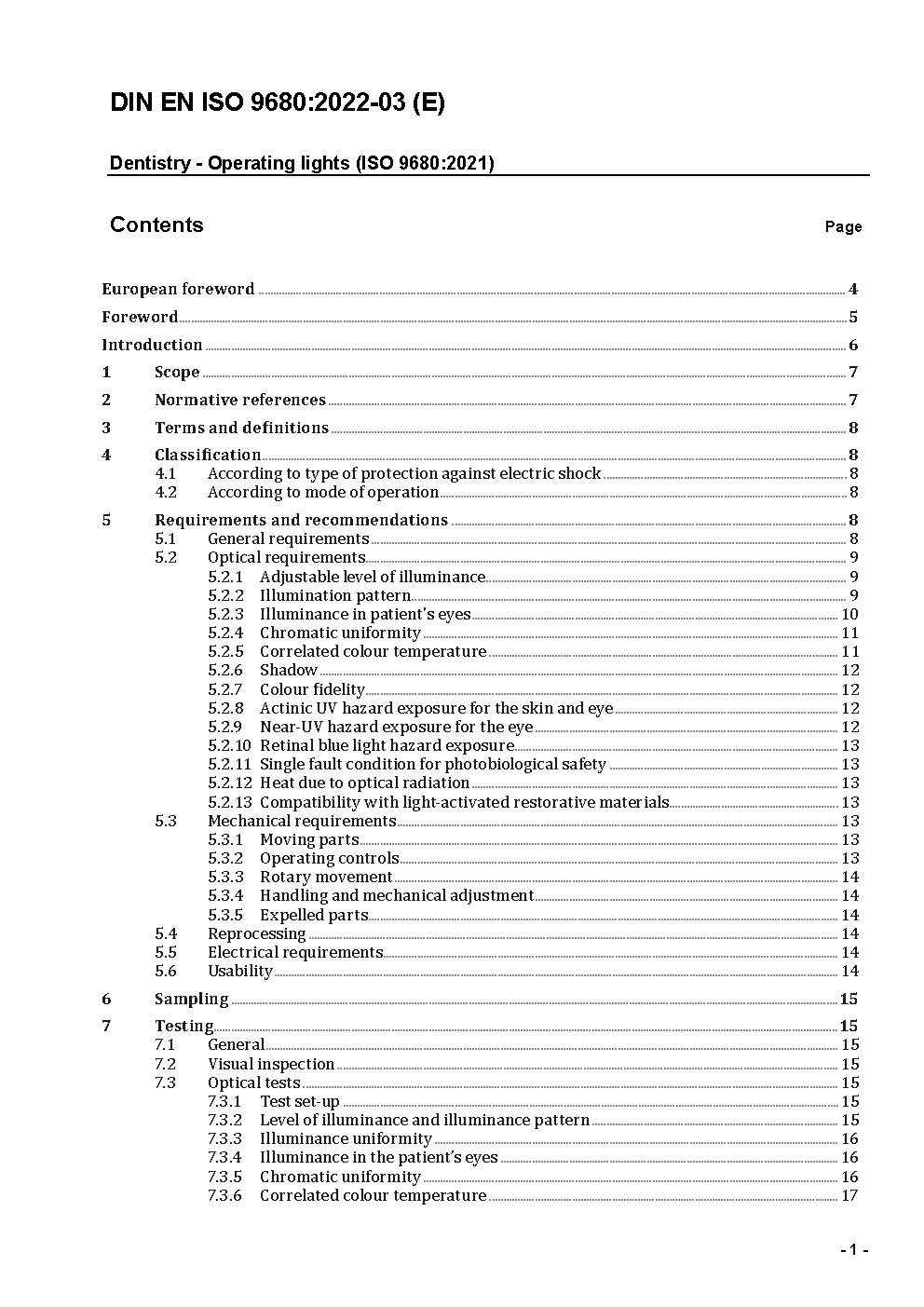 This International Standard specifies requirements and test methods for operating lights used in the dental office and intended for illuminating the oral cavity of patients. It also contains specifications on manufacturers' instructions for use, marking and packaging. This International Standard applies to operating lights, irrespective of the technology of the light source. Excluded are auxiliary light sources, e. g. from dental handpieces and dental headlamps. Also excluded are operating lights which are specifically designed for use in oral surgery.