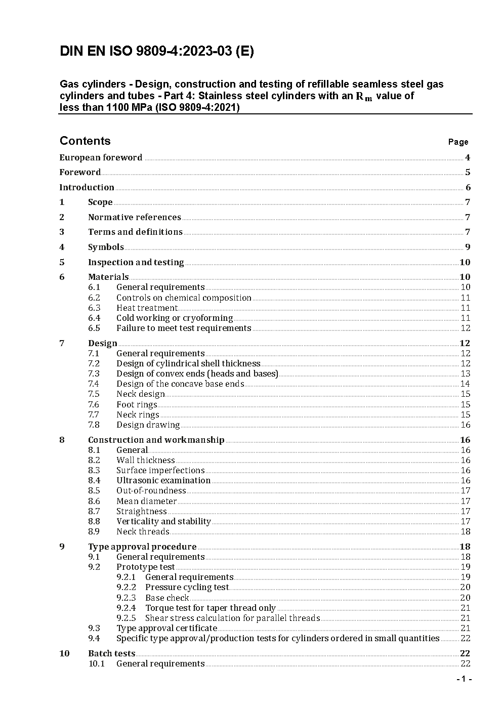 Gas cylinders - Design, construction and testing of refillable seamless steel gas cylinders and tubes - Part 4: Stainless steel cylinders with an R<(Index)m> value of less than 1100 MPa (ISO 9809-4:2021); German version EN ISO 9809-4:2022