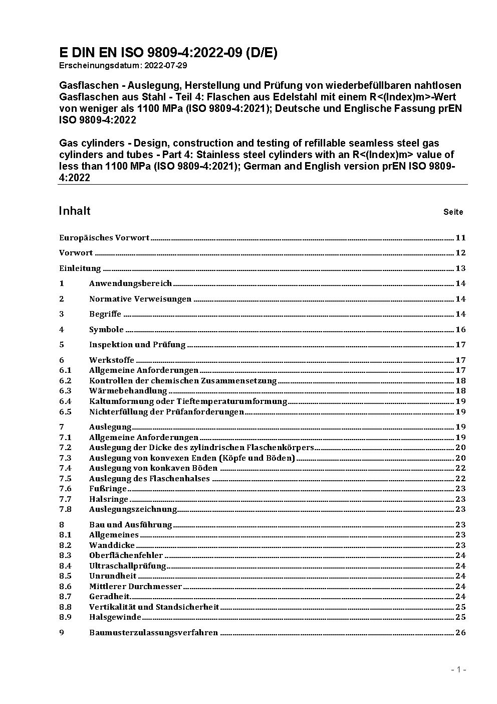 Gasflaschen - Auslegung, Herstellung und Prüfung von wiederbefüllbaren nahtlosen Gasflaschen aus Stahl - Teil 4: Flaschen aus Edelstahl mit einem R<(Index)m>-Wert von weniger als 1100 MPa (ISO 9809-4:2021); Deutsche Fassung EN ISO 9809-4:2022