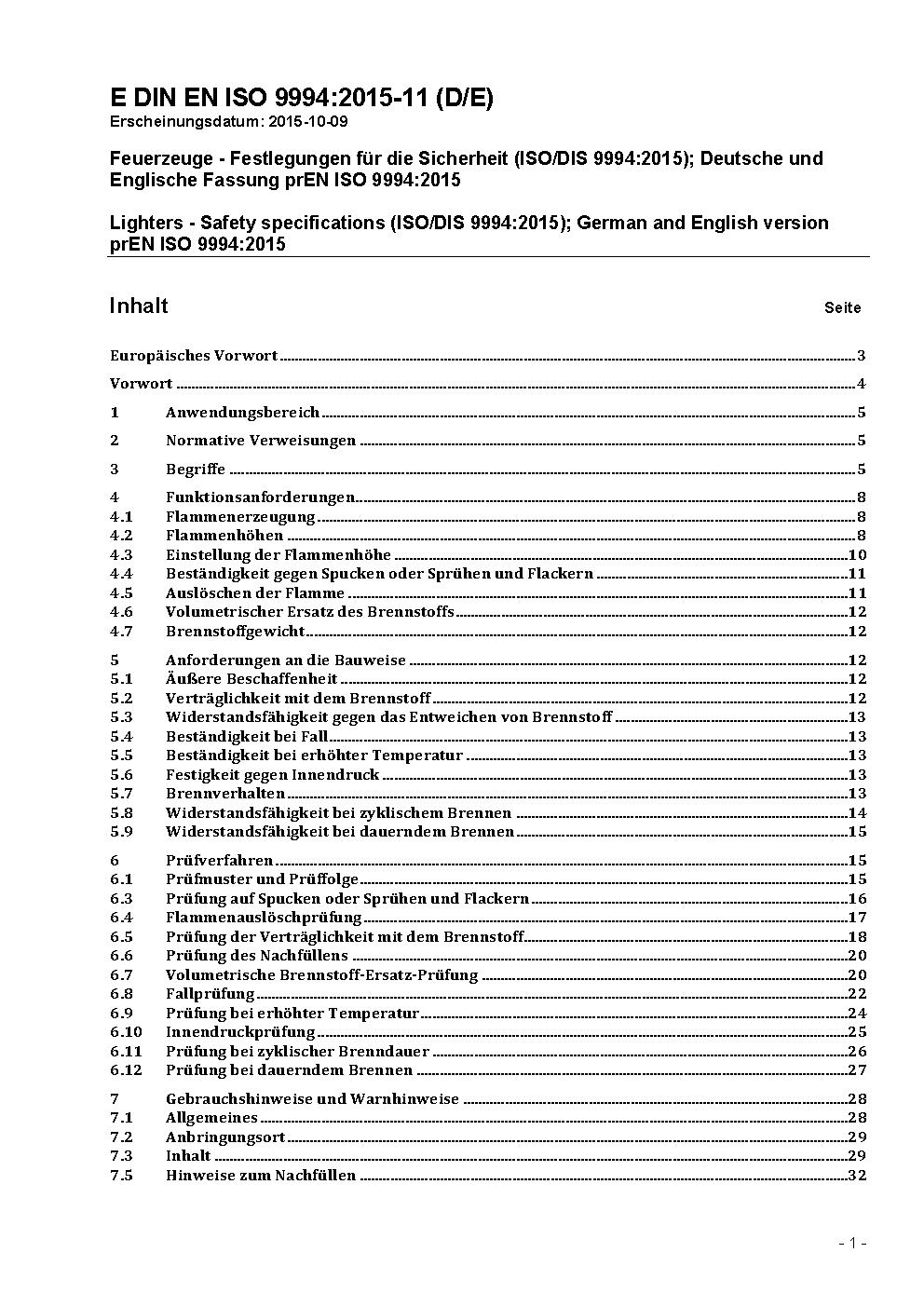 Lighters - Safety specifications (ISO/DIS 9994:2015); German and English version prEN ISO 9994:2015