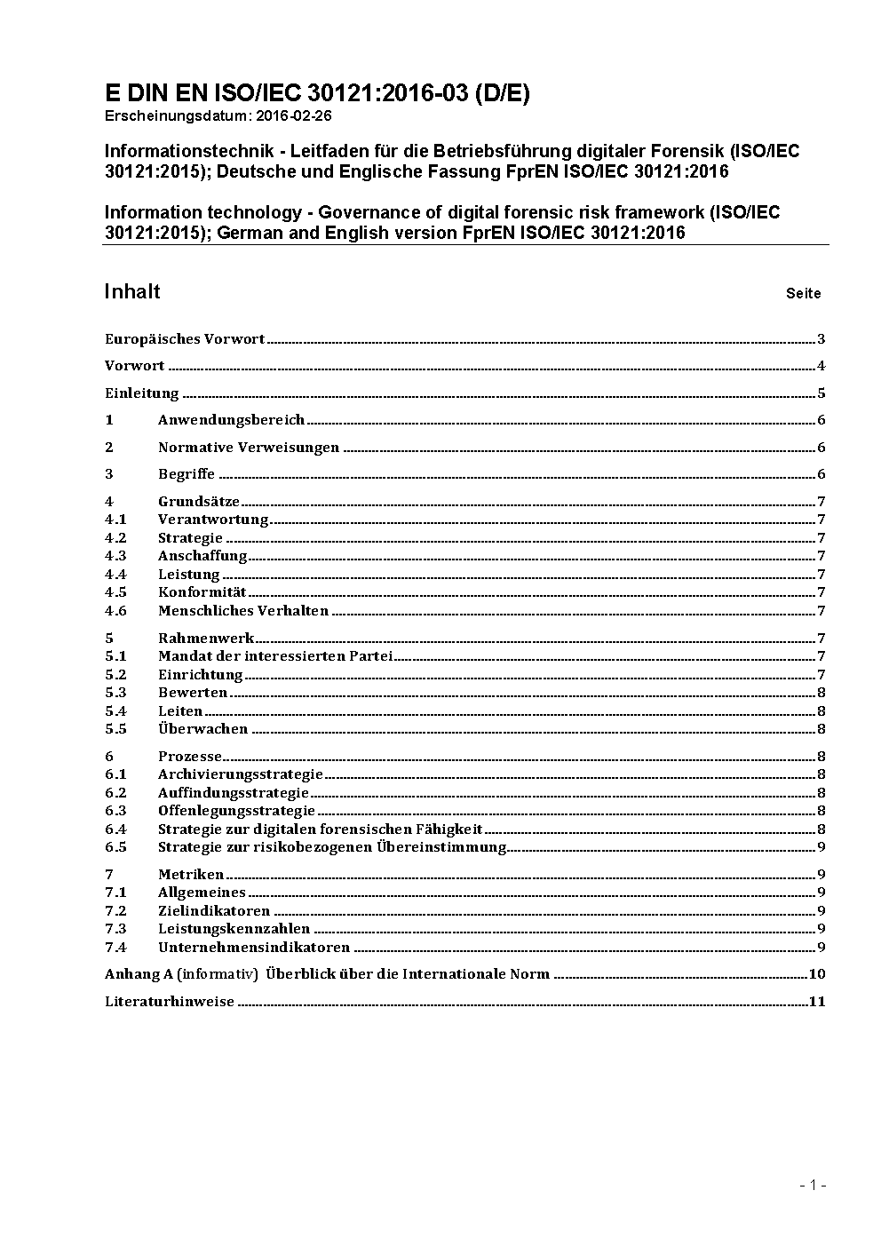 Information technology - Governance of digital forensic risk framework (ISO/IEC 30121:2015); German version EN ISO/IEC 30121:2016