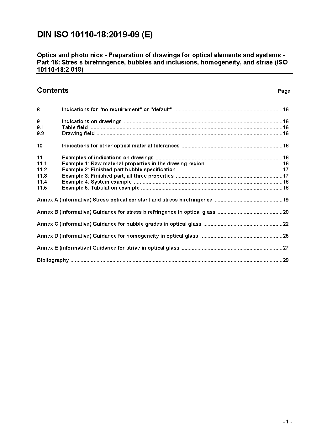 Optics and photonics - Preparation of drawings for optical elements and systems - Part 18: Stress birefringence, bubbles and inclusions, homogeneity, and striae (ISO 10110-18:2018)