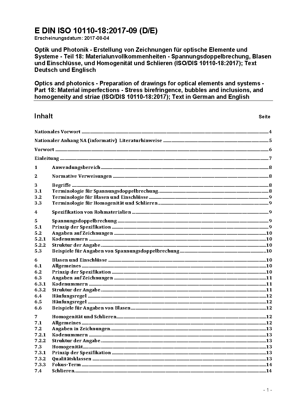 Optik und Photonik - Erstellung von Zeichnungen für optische Elemente und Systeme - Teil 18: Spannungsdoppelbrechung, Blasen und Einschlüsse, Homogenität, und Schlieren (ISO 10110-18:2018)