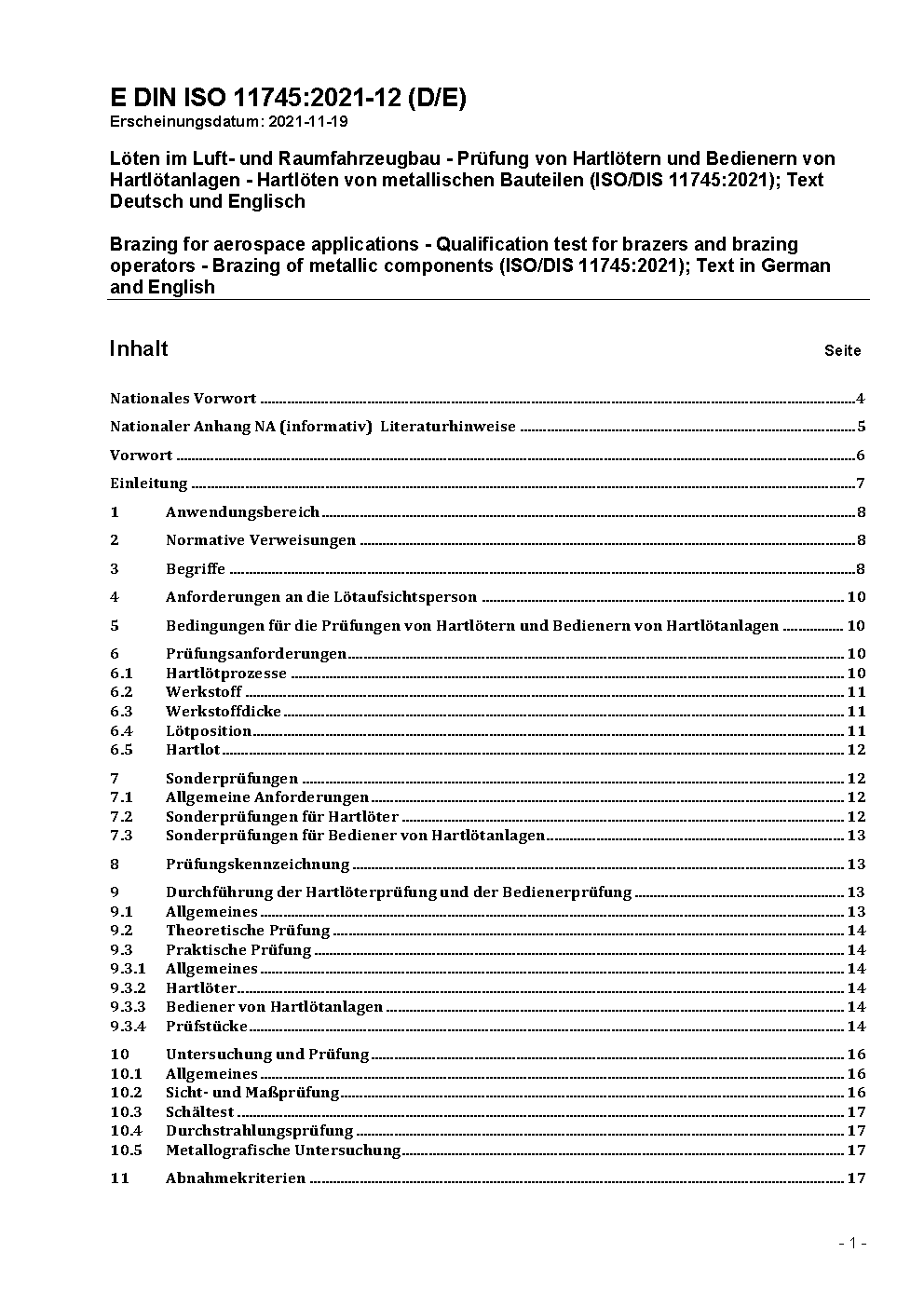 Brazing for aerospace applications - Qualification test for brazers and brazing operators - Brazing of metallic components (ISO 11745:2010 + Amd.1:2015)