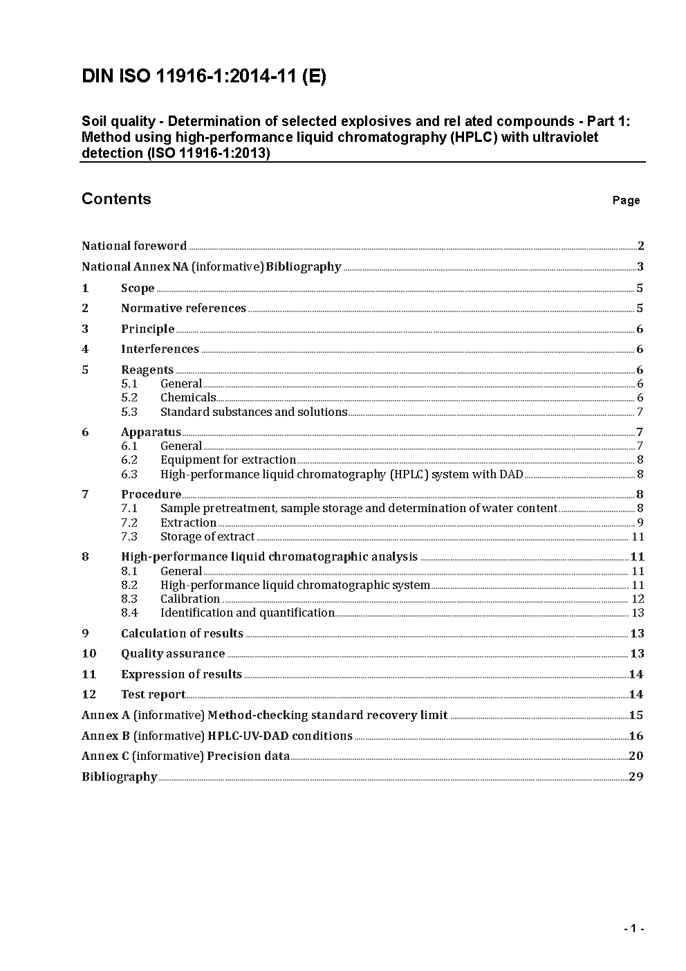 Soil quality - Determination of selected explosives and related compounds - Part 1: Method using high-performance liquid chromatography (HPLC) with ultraviolet detection (ISO 11916-1:2013)