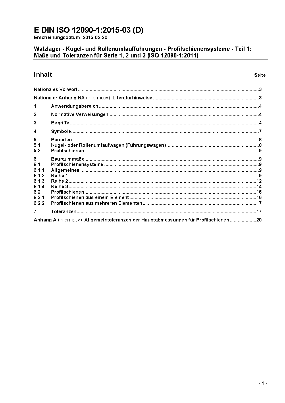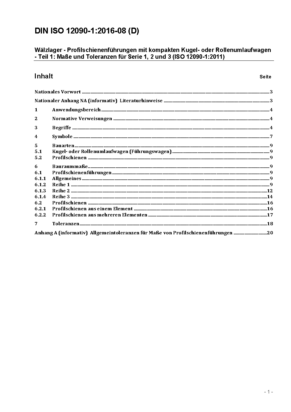 This part of ISO 12090 establishes the boundary dimensions and tolerances for series 1, 2 and 3 of the linear motion rolling bearings, profiled rail guides. These bearings consist of profiled rails with carriages, which can support forces from all perpendicular directions and moments around all axes and consists recirculating rolling elements. The internal design of these profiled rail guides is at the discretion of the manufacturer. An assembly as specified by the manufacturer may comprise one or more carriages on a profiled rail. Therefore the interchange or combination of these elements can only be carried out within the limits permitted by the manufacturer.