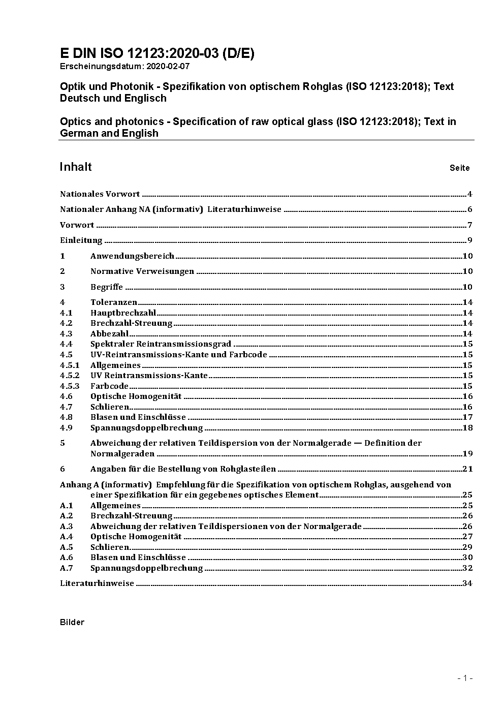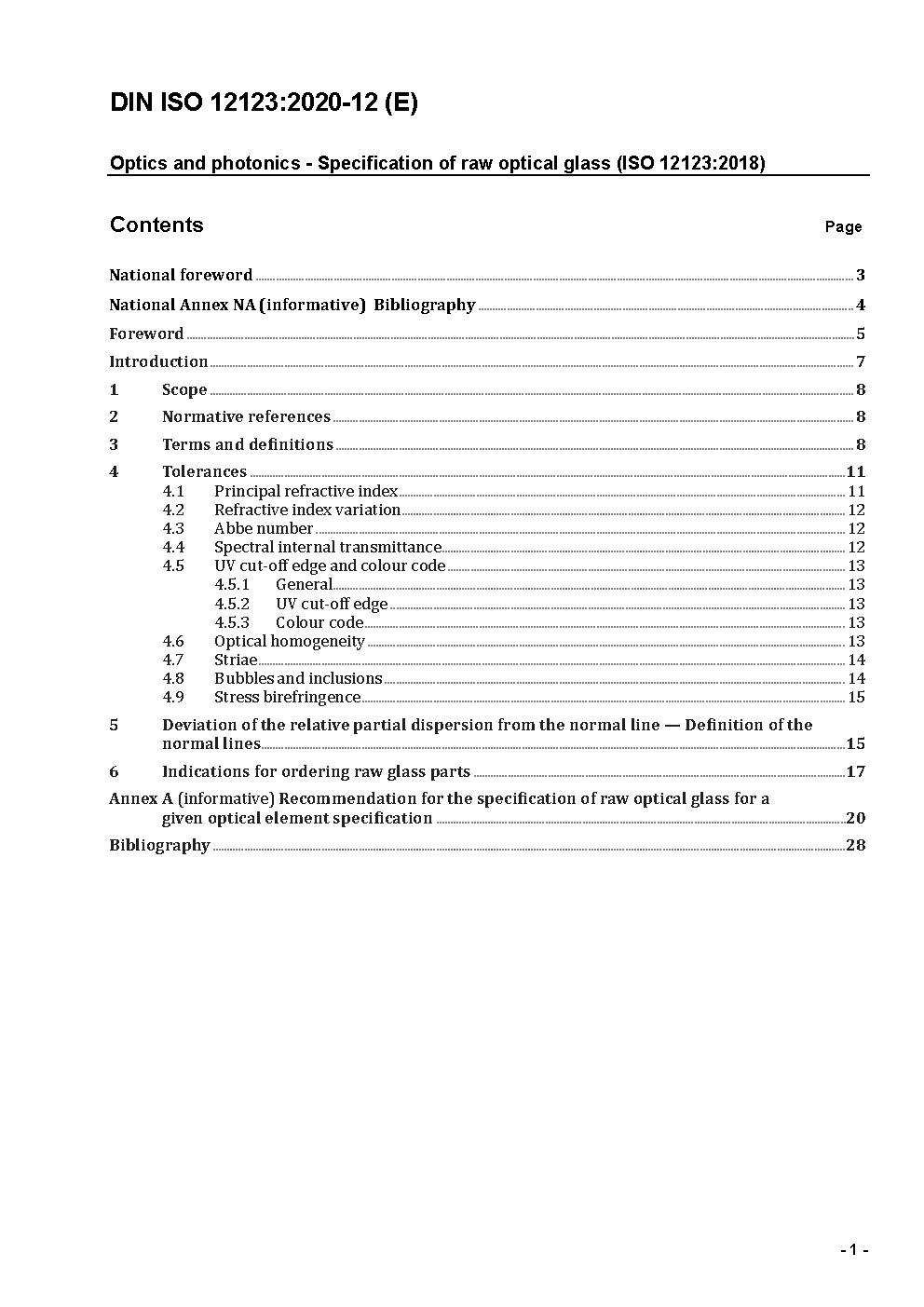 DIN ISO 12123 gives rules for the specification of raw optical glass. It serves as a complement to ISO 10110, which provides rules specifying finished optical elements. Since raw optical glass may be quite different in shape and size from the optical elements, its specification also differs from that of optical elements. DIN ISO 12123 provides guidelines for the essential specification characteristics of raw optical glass in order to improve communication between glass suppliers and optical element manufacturers. For specific applications (e. g. lasers, the infrared spectral range), specifications based on this Standard will have to be supplemented.