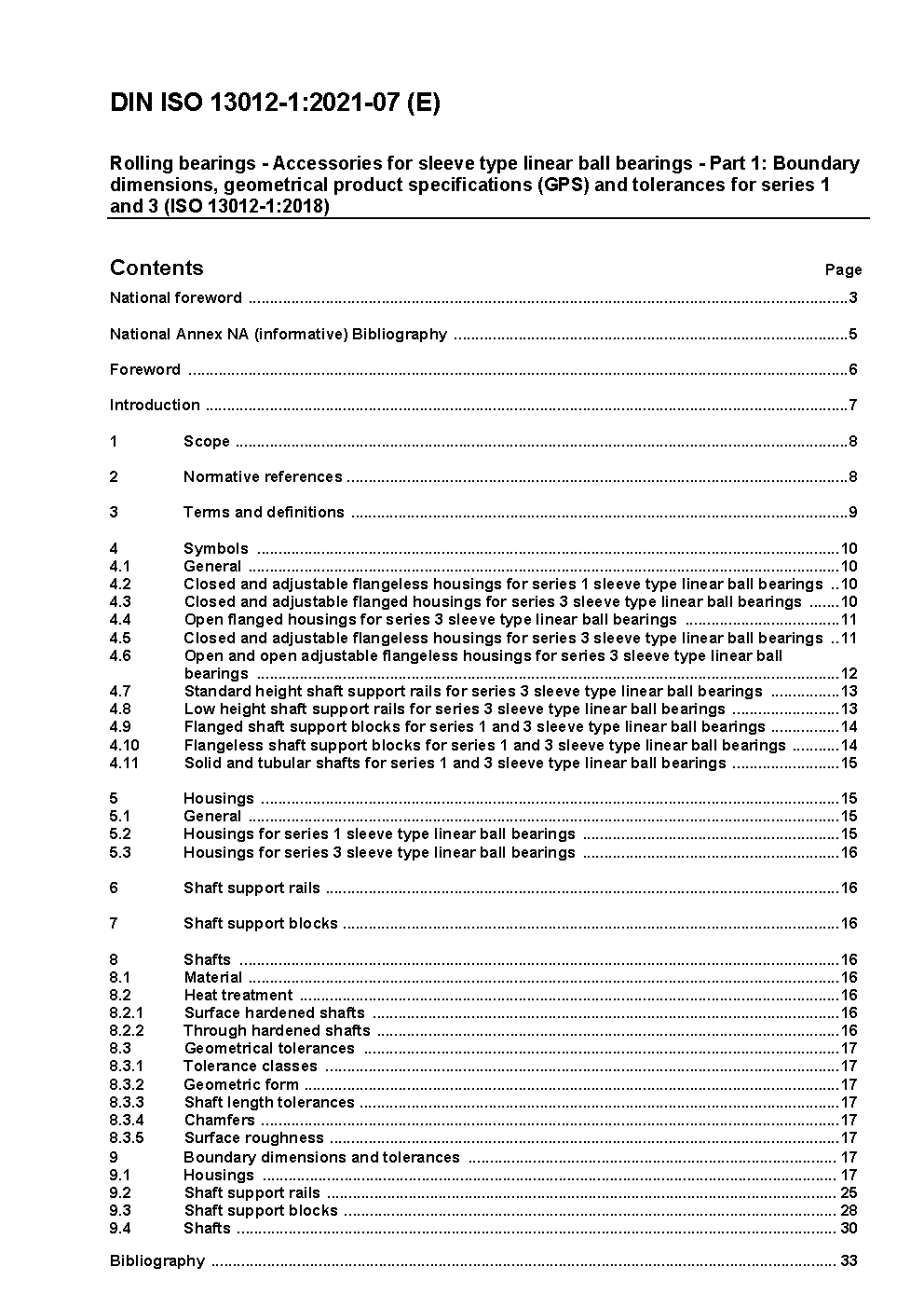 This document specifies the boundary dimensions, other relevant dimensions and their tolerances for the following accessories for sleeve type linear ball bearings which are specified in ISO 10285: Closed and adjustable flangeless housings for series 1 sleeve type linear ball bearings, closed and adjustable flanged housings for series 3 sleeve type linear ball bearings, open flanged housings for series 3 sleeve type linear ball bearings, closed and adjustable flangeless housings for series 3 sleeve type linear ball bearings, open and open adjustable flangeless housings for series 3 sleeve type linear ball bearings, standard height shaft support rails for series 3 sleeve type linear ball bearings, low height shaft support rails for series 3 sleeve type linear ball bearings, flanged shaft support blocks for series 1 and 3 sleeve type linear ball bearings, flangeless shaft support blocks for series 1 and 3 sleeve type linear ball bearings, solid and tubular shafts for series 1 and 3 sleeve type linear ball bearings.