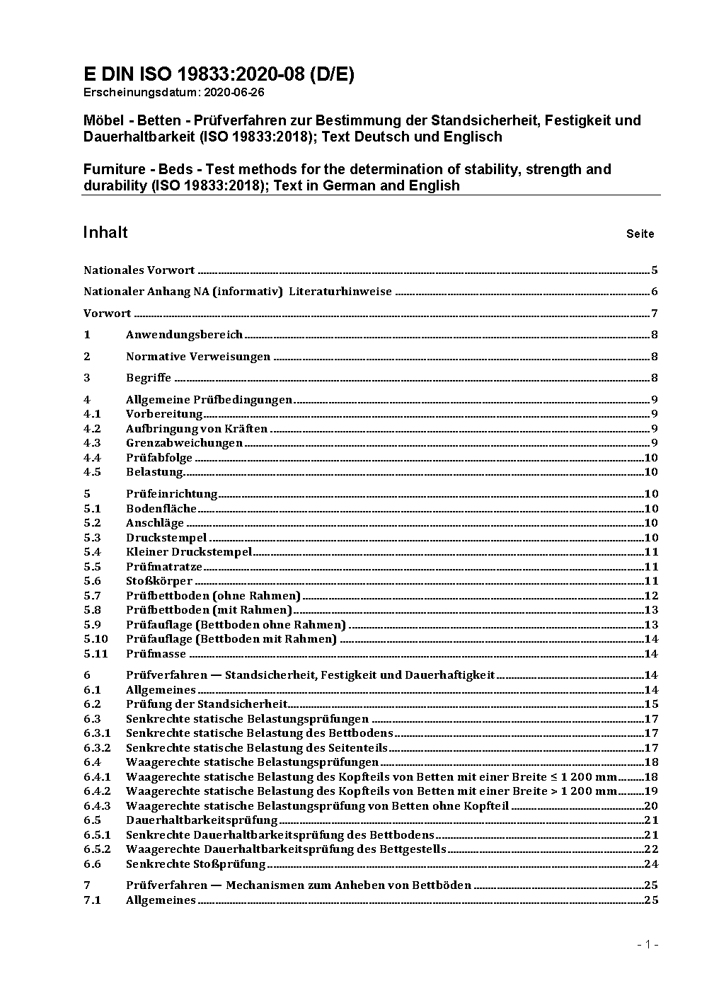 Möbel - Betten - Prüfverfahren zur Bestimmung der Standsicherheit, Festigkeit und Dauerhaltbarkeit (ISO 19833:2018); Text Deutsch und Englisch