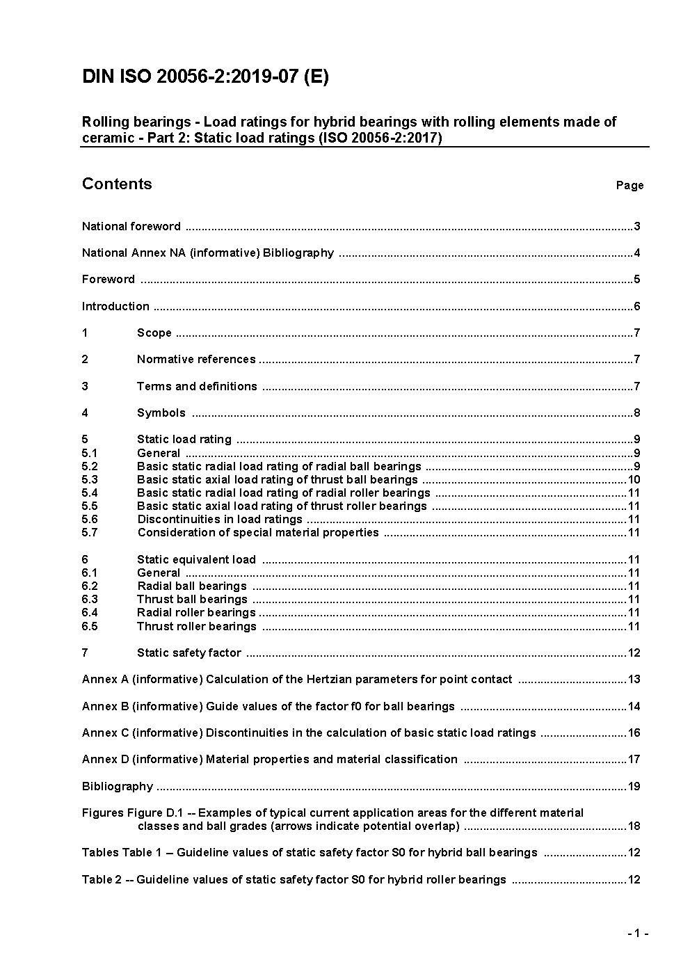 Hybrid bearings are rolling bearings with raceways consisting of commonly used rolling bearing steel and rolling elements made from silicon nitride (for definitions, see ISO 5593). Due to the higher modulus of elasticity of the ceramic rolling elements, hybrid bearings have a noticeably smaller contact ellipse at the same load than rolling bearings with rolling elements made of rolling bearing steel. This will lead to higher contact stresses at the same load. Since the second edition of ISO 76 in 1987, the static capacity of rolling bearings is defined by a permissible Hertzian contact stress in the highest loaded contact. In rolling bearings made of steel, this contact stress will lead to a permanent plastic deformation at raceway and rolling element of approximately 1/10 000th of the rolling element diameter. In hybrid bearings, no significant plastic deformation will occur at the rolling element, resulting in a smaller total plastic deformation in the rolling contact. Therefore, in accordance with industrial practice, slightly higher permissible Hertzian stresses are defined for hybrid bearings. The guideline values of the static safety factor, S0, have been increased accordingly to maintain the same overall safety for the raceway. This document specifies methods of calculating the static load ratings for hybrid bearings with bearing rings made of contemporary, commonly used, high quality hardened bearing steel, in accordance with good manufacturing practice, and a full set of rolling elements made of silicon nitride (Si3N4) in contemporary, commonly used material and manufacturing quality.