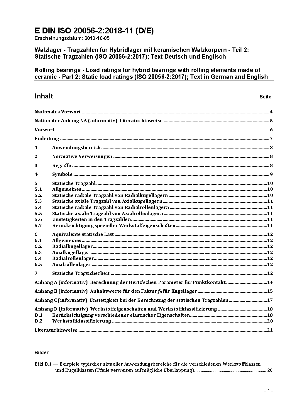 Rolling bearings - Load ratings for hybrid bearings with rolling elements made of ceramic - Part 2: Static load ratings (ISO 20056-2:2017); Text in German and English
