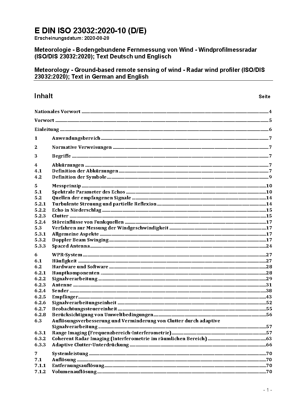 Meteorology - Ground-based remote sensing of wind - Radar wind profiler (ISO/DIS 23032:2020); Text in German and English