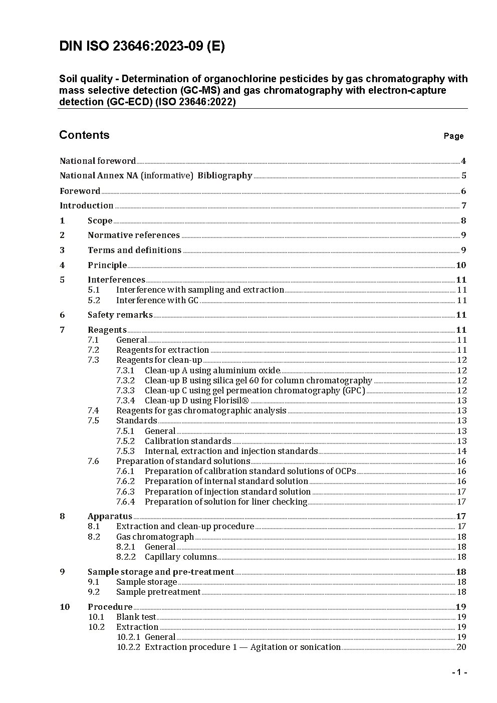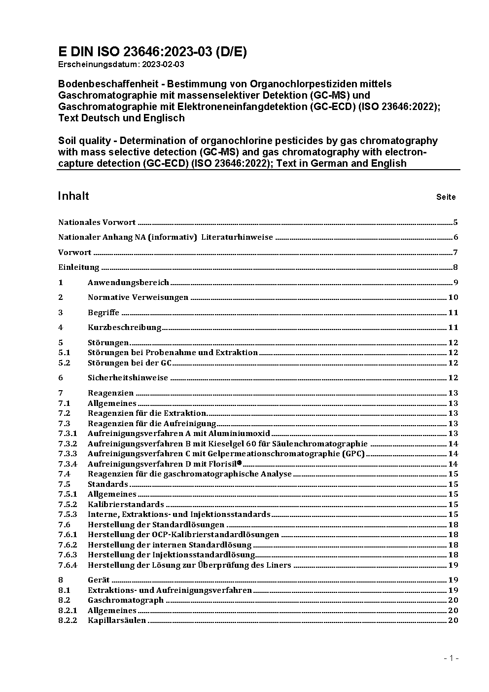 Bodenbeschaffenheit - Bestimmung von Organochlorpestiziden mittels Gaschromatographie mit massenselektiver Detektion (GC-MS) und Gaschromatographie mit Elektroneneinfangdetektion (GC-ECD) (ISO 23646:2022); Text Deutsch und Englisch
