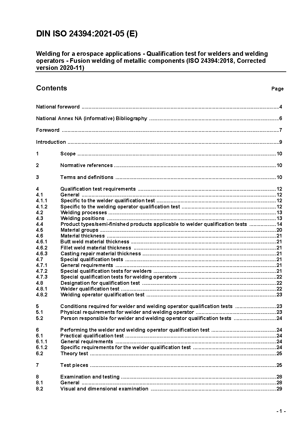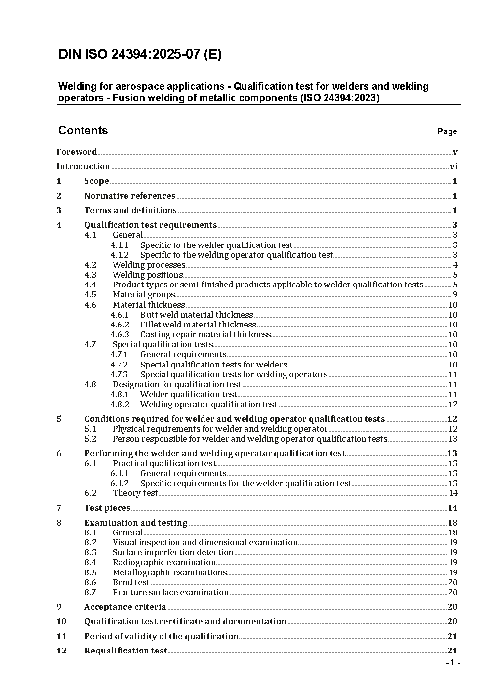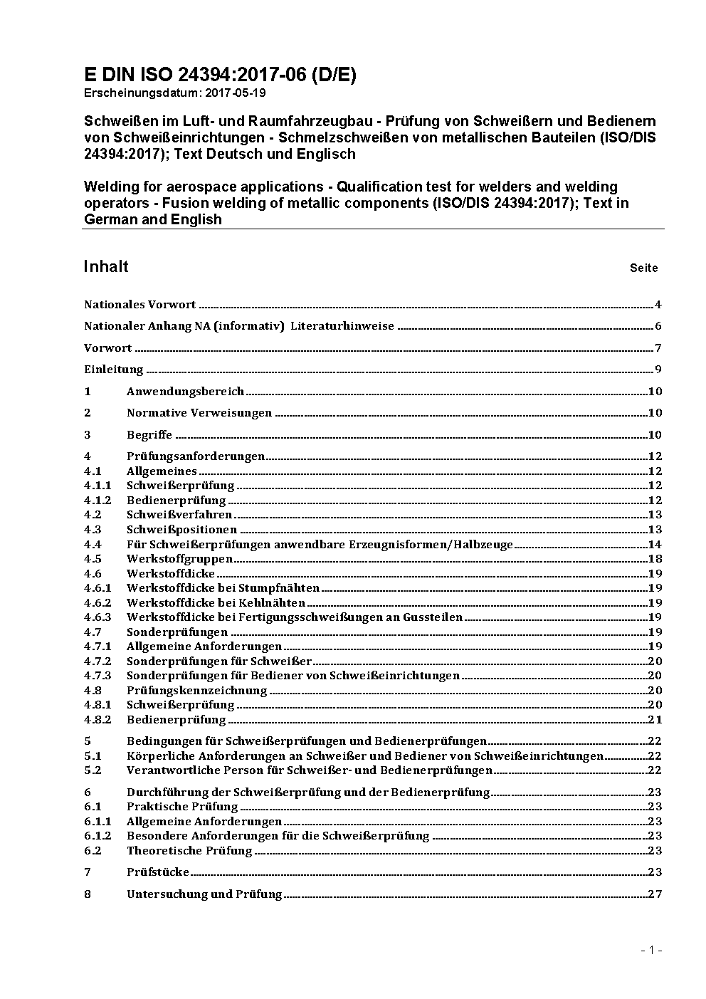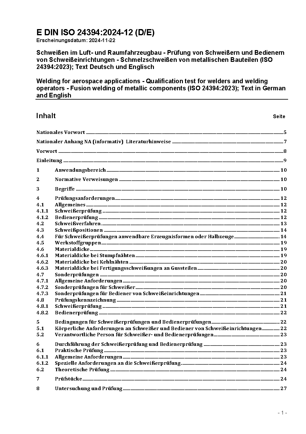 Schweißen im Luft- und Raumfahrzeugbau - Prüfung von Schweißern und Bedienern von Schweißeinrichtungen - Schweißen von metallischen Bauteilen (ISO/DIS 24394:2007)