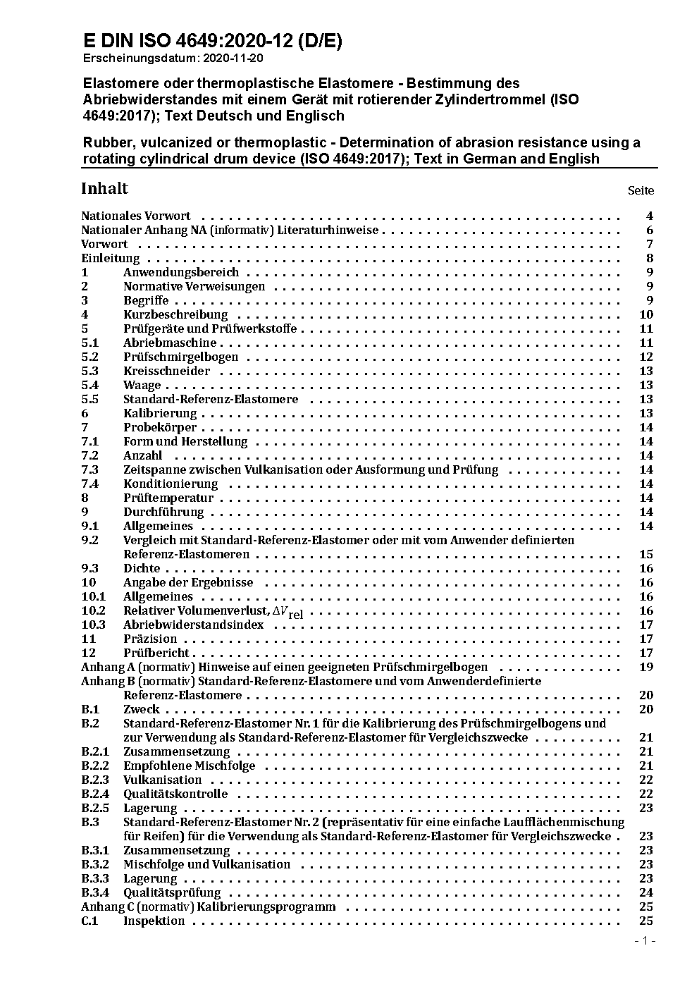 Elastomere oder thermoplastische Elastomere - Bestimmung des Abriebwiderstandes mit einem Gerät mit rotierender Zylindertrommel (ISO 4649:2017); Text Deutsch und Englisch
