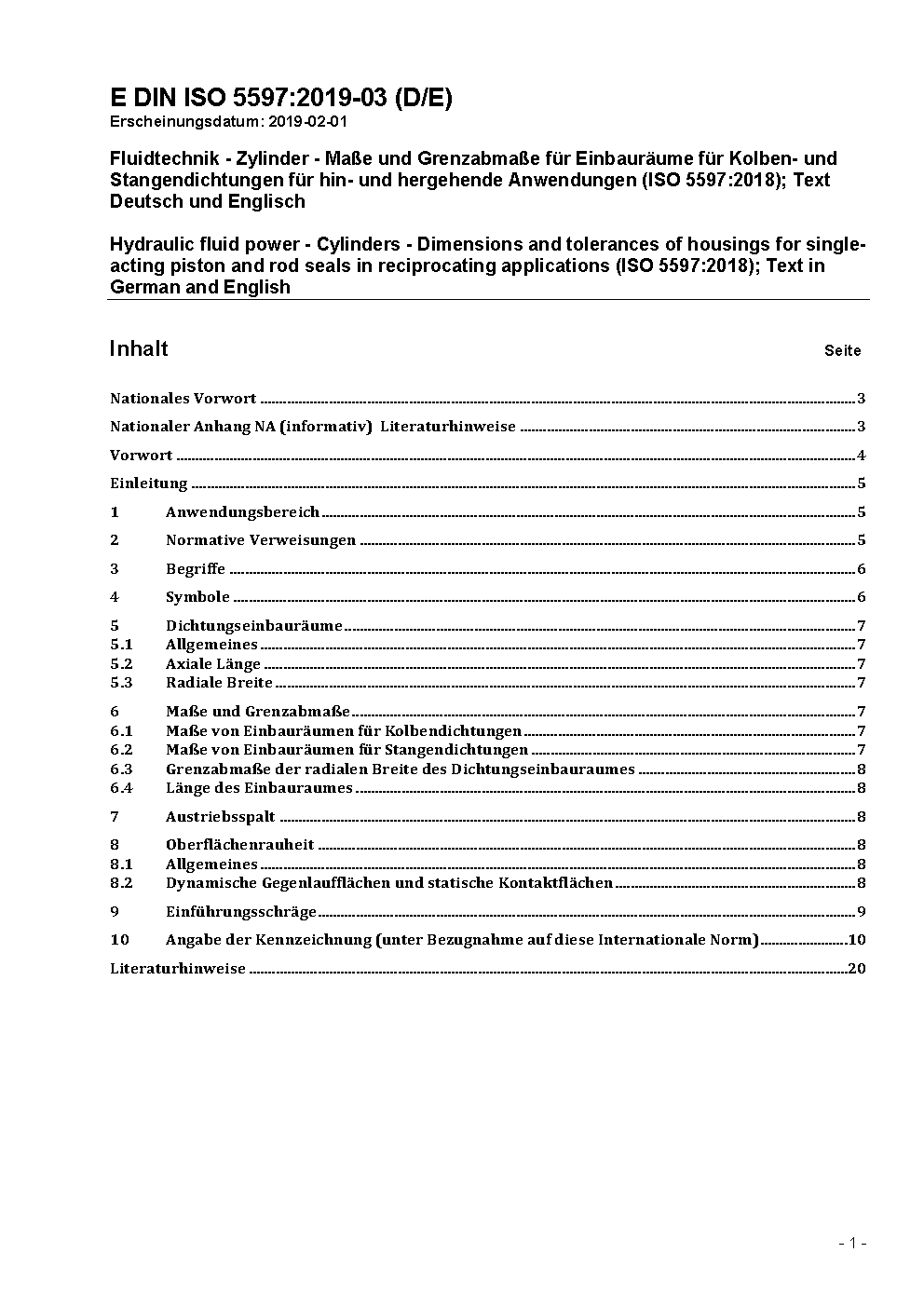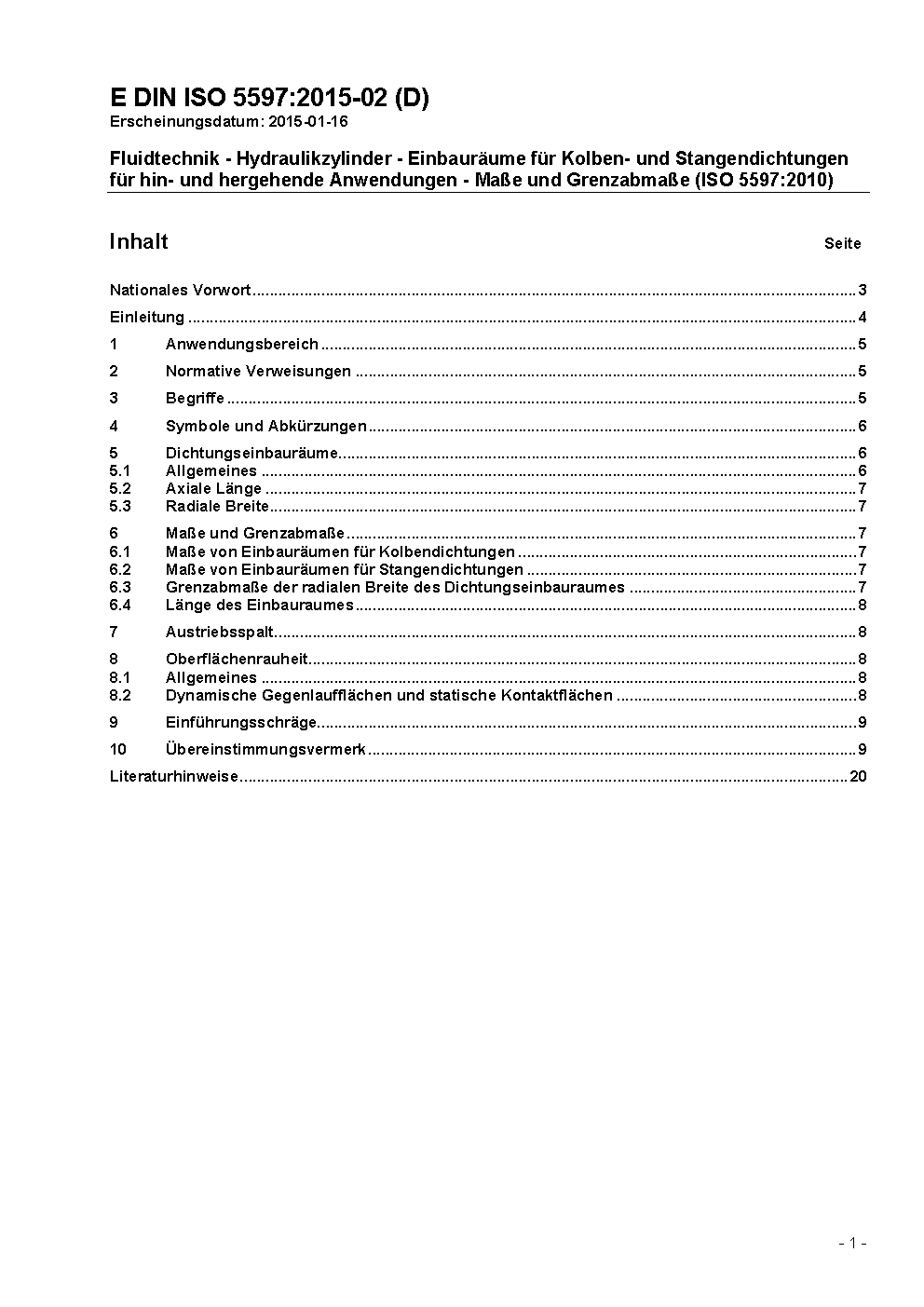 Sealing devices are used in fluid power systems to contain the pressurized fluid with components having elements with linear motion, i.e. for hydraulic cylinders by sealing both cylinder piston and cylinder piston rod. ISO 5597:2010 defines dimensions and tolerances of rod and piston seal housings for reciprocating applications. An additional range of seal housings is defined to meet the reduced envelope requirements of the 160 bar compact series of ISO 6020-2; these smaller section seals require stricter piston rod and cylinder bore tolerances. This standard contains the German edition of ISO 5597:2010 which was developed by the Technical Committee ISO/TC 131 Fluid power systems.