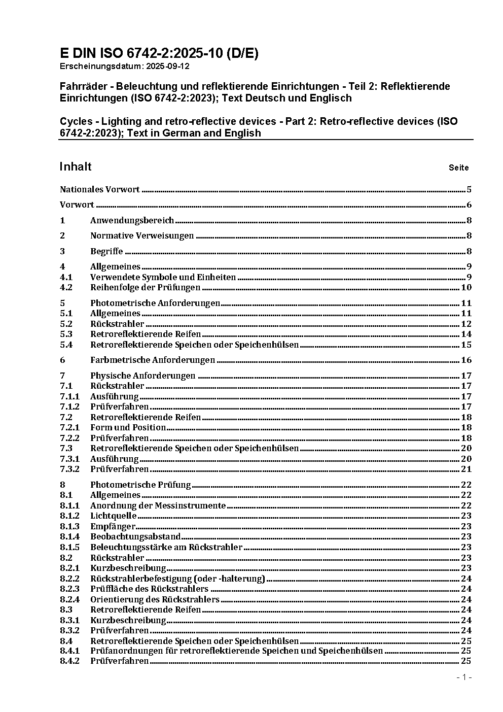 Fahrräder - Beleuchtung und reflektierende Einrichtungen - Teil 2: Reflektierende Einrichtungen (ISO 6742-2:2023); Text Deutsch und Englisch