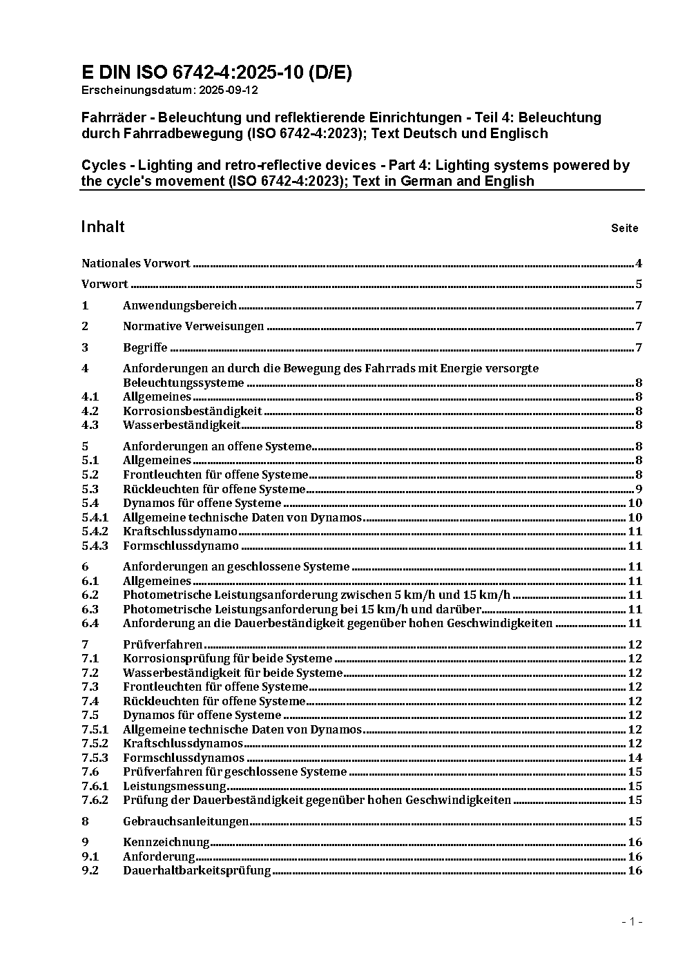 Fahrräder - Beleuchtung und reflektierende Einrichtungen - Teil 4: Beleuchtung durch Fahrradbewegung (ISO 6742-4:2023); Text Deutsch und Englisch