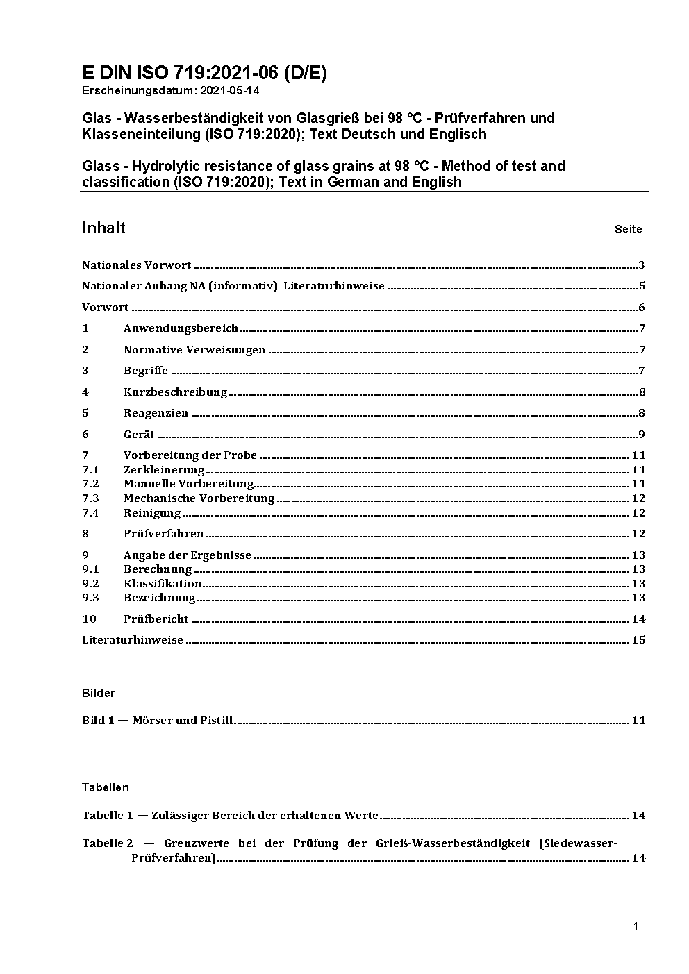 Glas - Wasserbeständigkeit von Glasgrieß bei 98 °C - Prüfverfahren und Klasseneinteilung (ISO 719:2020); Text Deutsch und Englisch