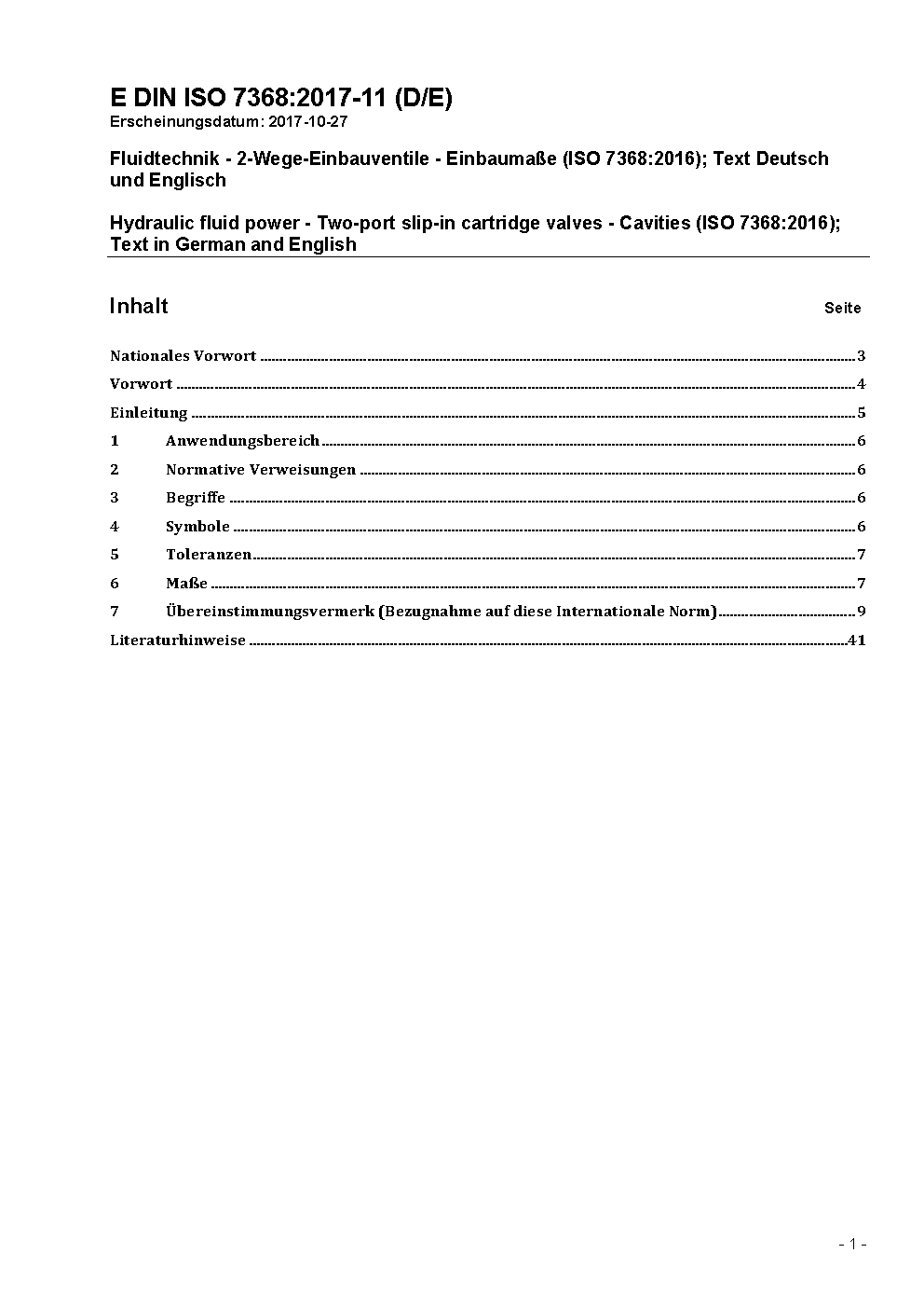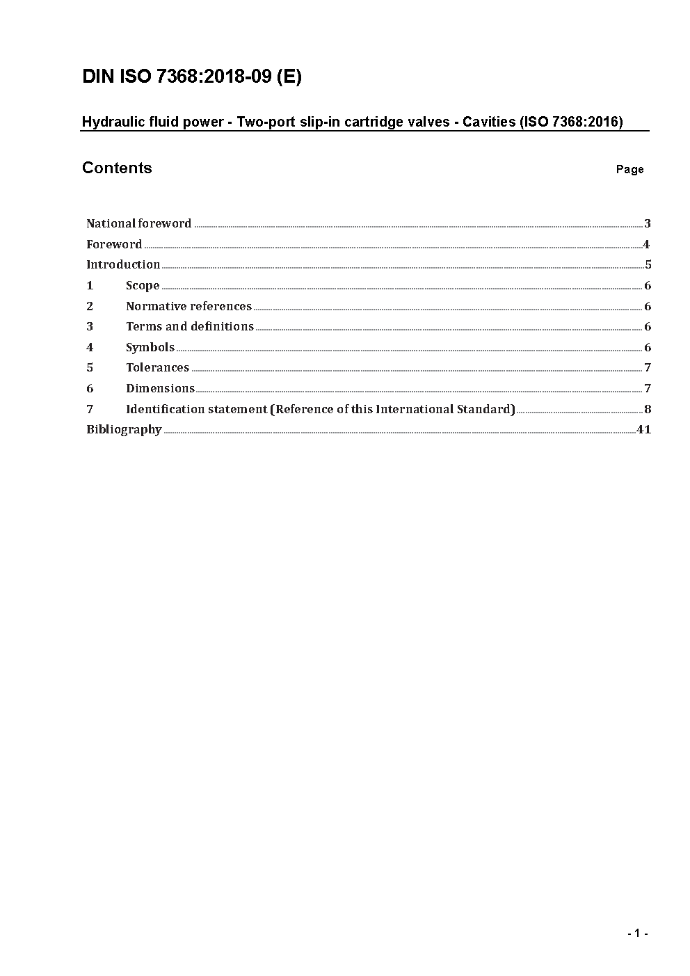The document specifies the dimensions and other relating to cavities in which two-port hydraulic slip-in cartridge valves are mounted in order to ensure interchangeability.