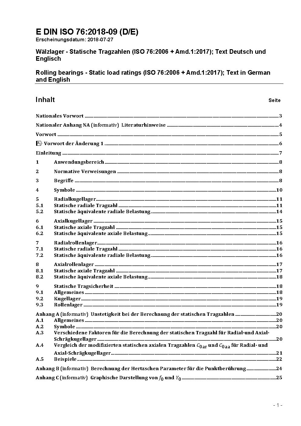 This supplement gives guidelines for the calculation of the static load rating for hybrid bearings. It is applicable for hybrid bearings with rings, manufactured from contemporary, commonly used, high quality hardened bearing steel, in accordance with good manufacturing practice and with rolling elements made of ceramic, commonly silicon nitride (Si3N4), with today's commonly used material- and manufacturing quality. When using hybrid bearings the reduced static load ratings and the recommendations for the static safety factor according to DIN ISO 76 have to be consider in comparison to conventional rolling bearings.
