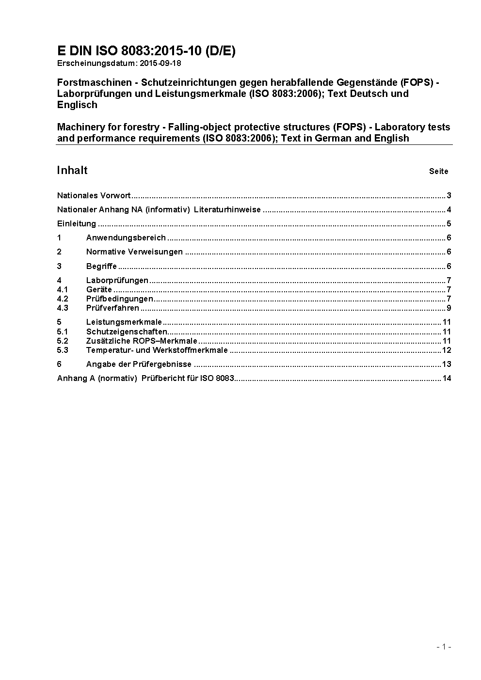 Machinery for forestry - Falling-object protective structures (FOPS) - Laboratory tests and performance requirements (ISO 8083:2006); Text in German and English