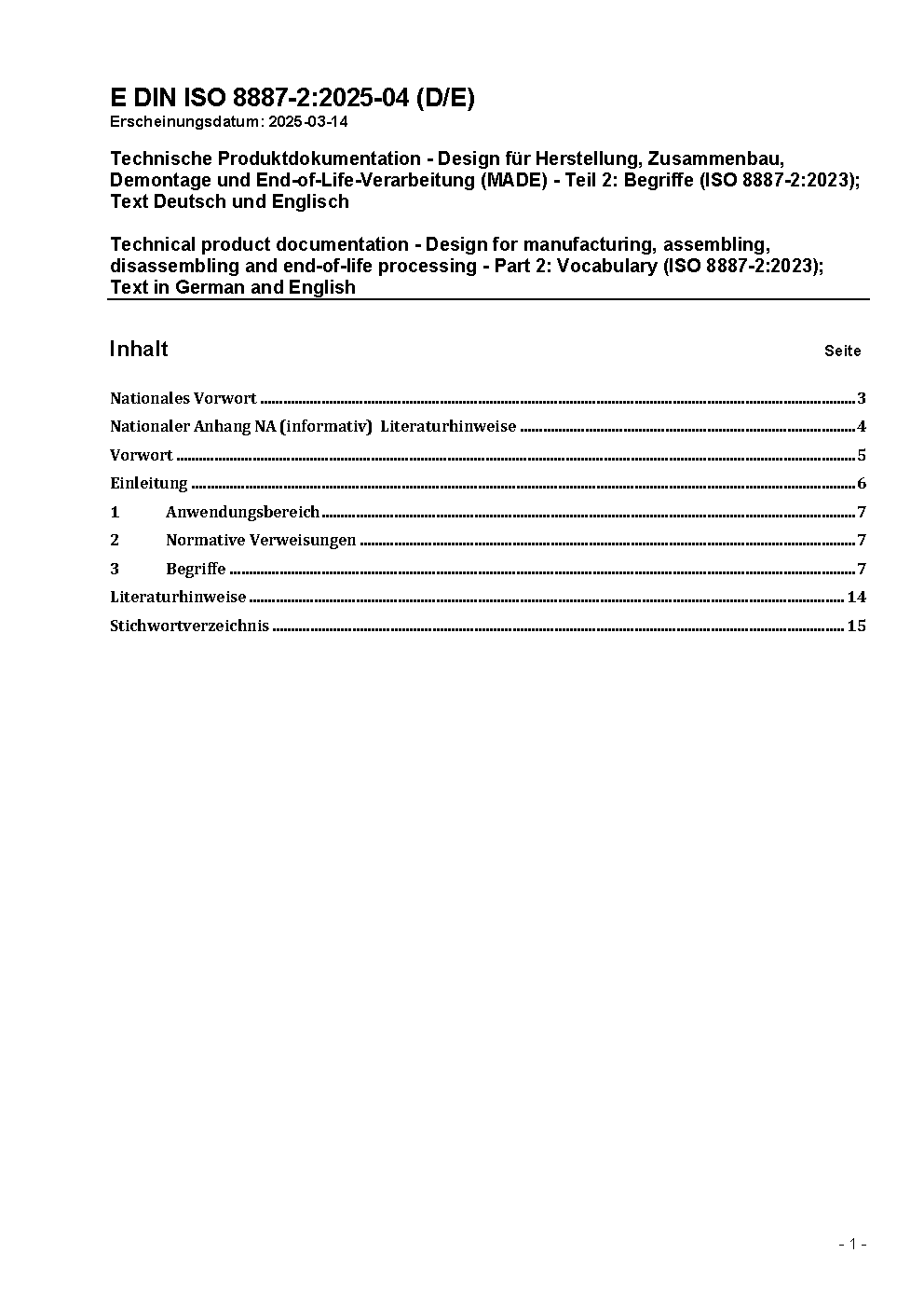 Technische Produktdokumentation - Design für Herstellung, Zusammenbau, Demontage und End-of-Life-Verarbeitung (MADE) - Teil 2: Begriffe (ISO 8887-2:2023); Text Deutsch und Englisch