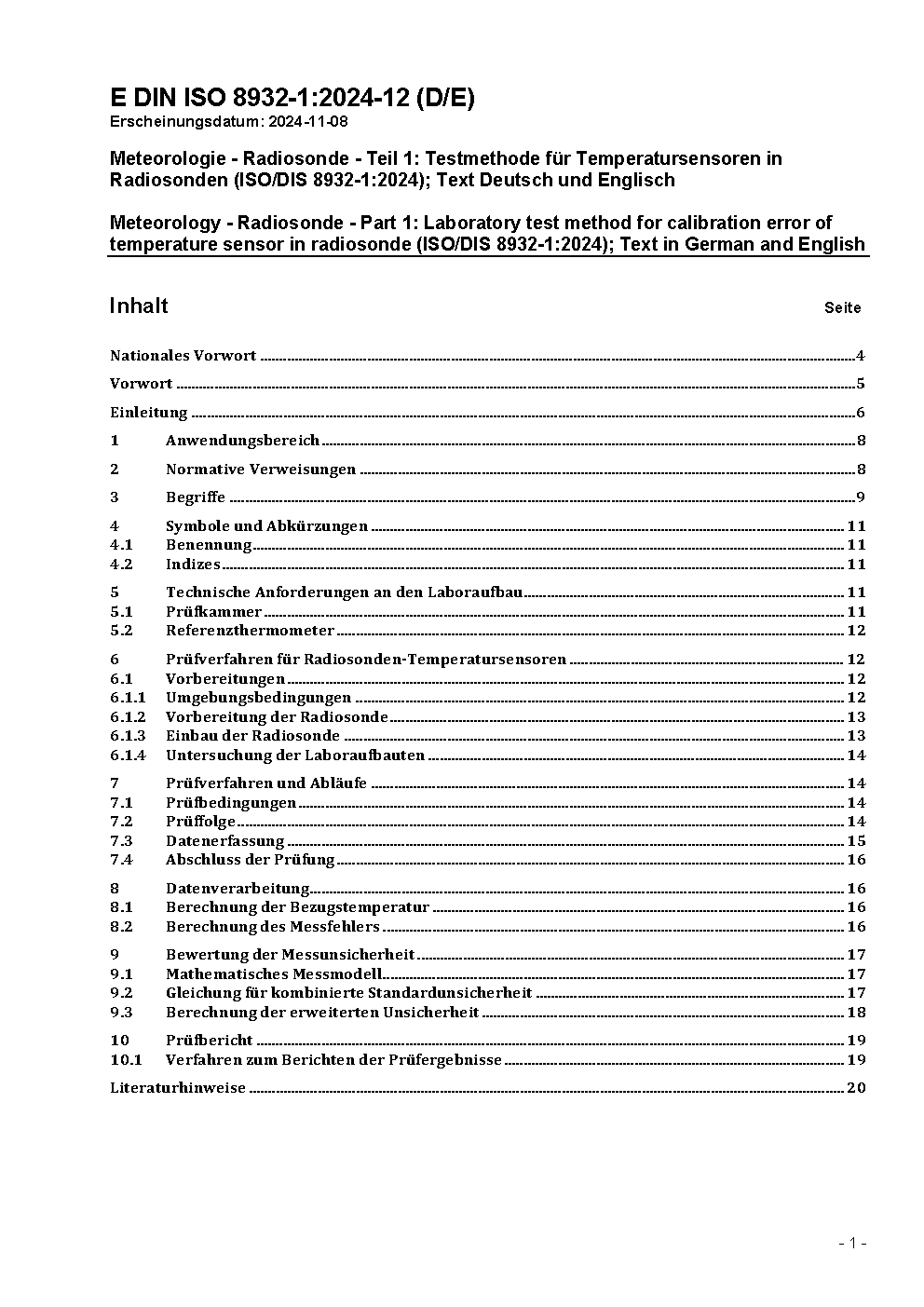 Meteorologie - Radiosonde - Teil 1: Testmethode für Temperatursensoren in Radiosonden (ISO/DIS 8932-1:2024); Text Deutsch und Englisch