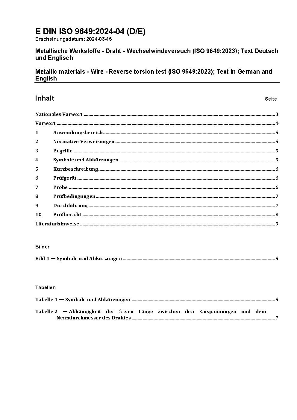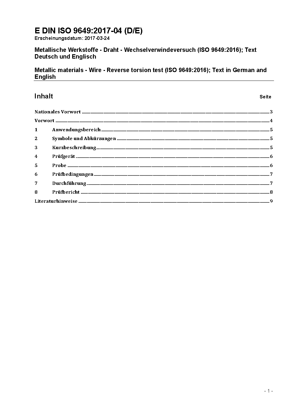 Metallic materials; wire; reverse torsion test; identical with ISO 9649:1990