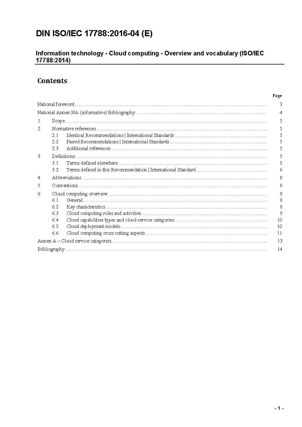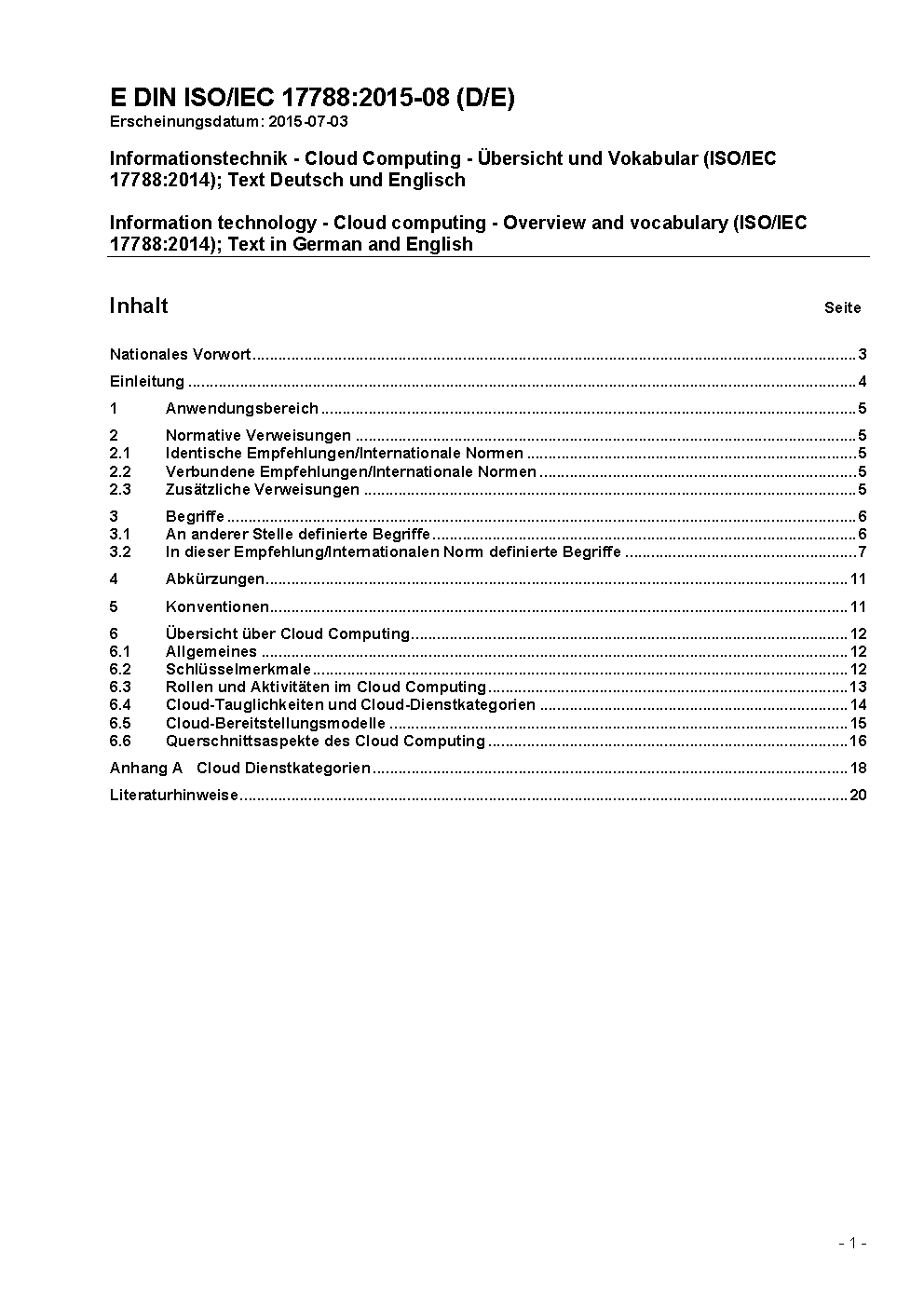This Standard (German Version of ISO/IEC 17788) provides an overview of cloud computing, and defines related terms. The terms and definitions provided in this Standard cover commonly used terms and definitions in cloud computing standards; will not cover all terms and definitions used in cloud computing standards; and do not preclude the definition of additional terms for use in cloud computing standards.
