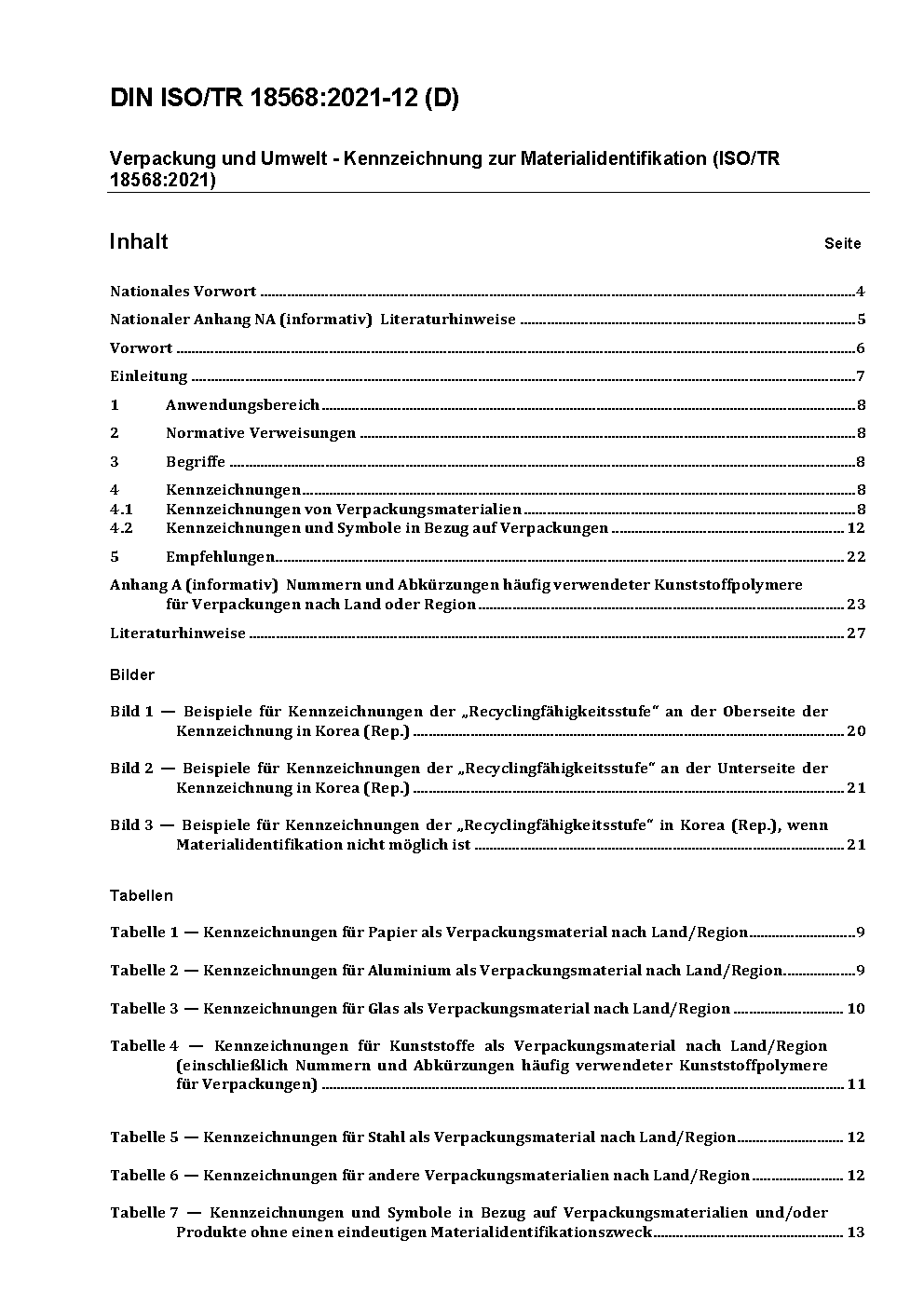 Verpackung und Umwelt - Kennzeichnung zur Materialidentifikation (ISO/TR 18568:2021)