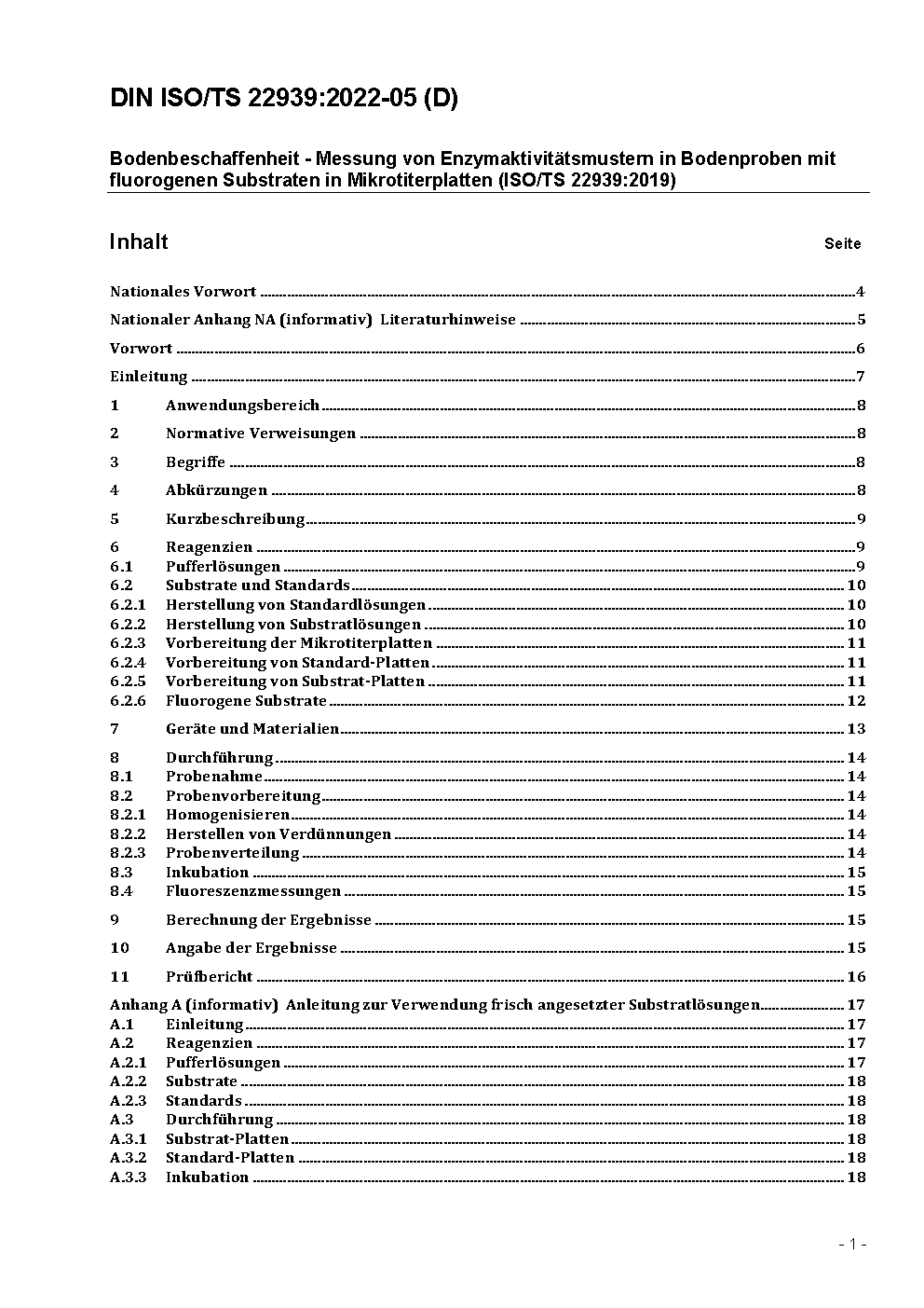 Bodenbeschaffenheit - Messung von Enzymaktivitätsmustern in Bodenproben mit fluorogenen Substraten in Mikrotiterplatten (ISO/TS 22939:2019)