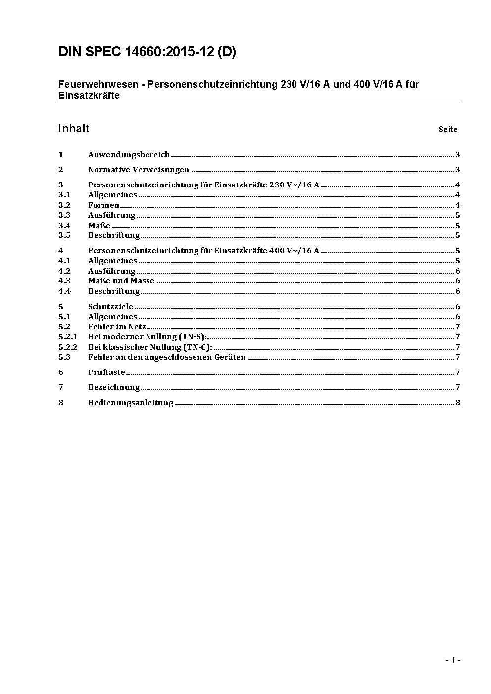 This standard describes personal protective devices for the use as mobile protective devices by rescue teams in unknown electrical network (230 V~/400 V~/16 A). These personal protective devices are not intended to be used for generating sets according DIN 14685 or DIN 14686 and DIN 14687.