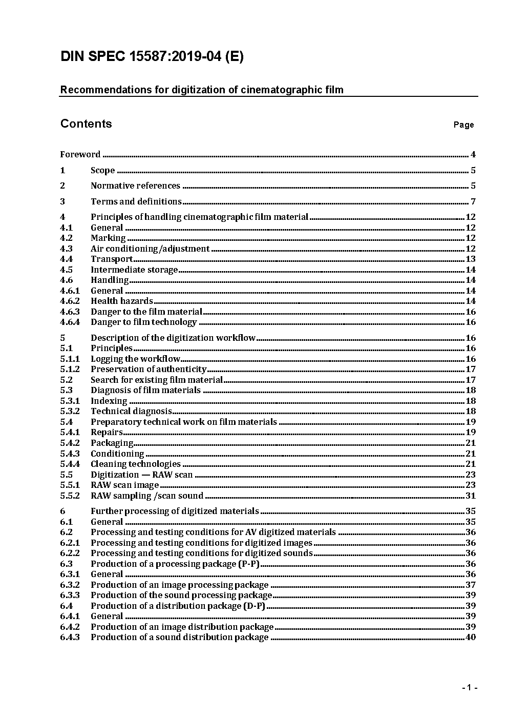 This Document specifies requirements for a digitization workflow for cinematographic film including magnetic sound film and preparatory work for digitization, which covers the digitization itself as well as post-treatment. Complying with these requirements shall ensure a sustainable digitization. Sustainability is reached if, to the current state of knowledge: - the best quality of the original film material is selected, - this materials are edited optimal, - the quality of the original film material retrieves in the digitization, - the post-treatment of the digitization comply with the ethical principles of archival preservation - a suitable data format is used for the digitization. The guideline shall also give advice for digitization projects without the purpose of a sustainable digitization.The guideline is addressed to archives, producers and right holders, organisations and institutes of the film industry and filmmakers.