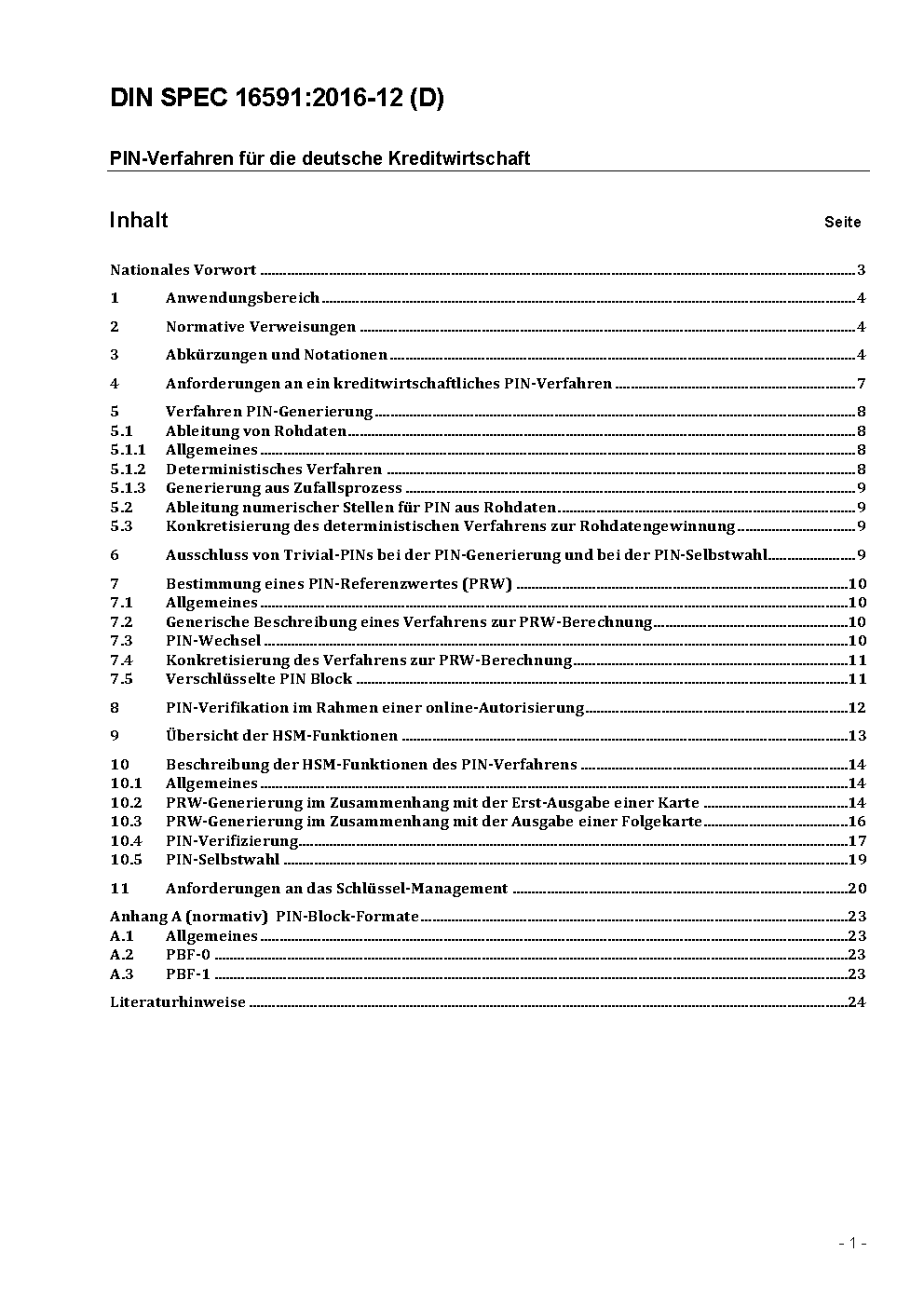 This DIN SPEC describes procedures for PIN generation, PIN verification and PIN change processed by the customer. The aim of this document is to define standardized requirements for the implementation of these processes throughout the credit services sector. Therefore a generic description of the procedure has been chosen to allow on the one hand enough flexibility for the implementation and otherwise defines a general framework which is necessary for a secure operation.