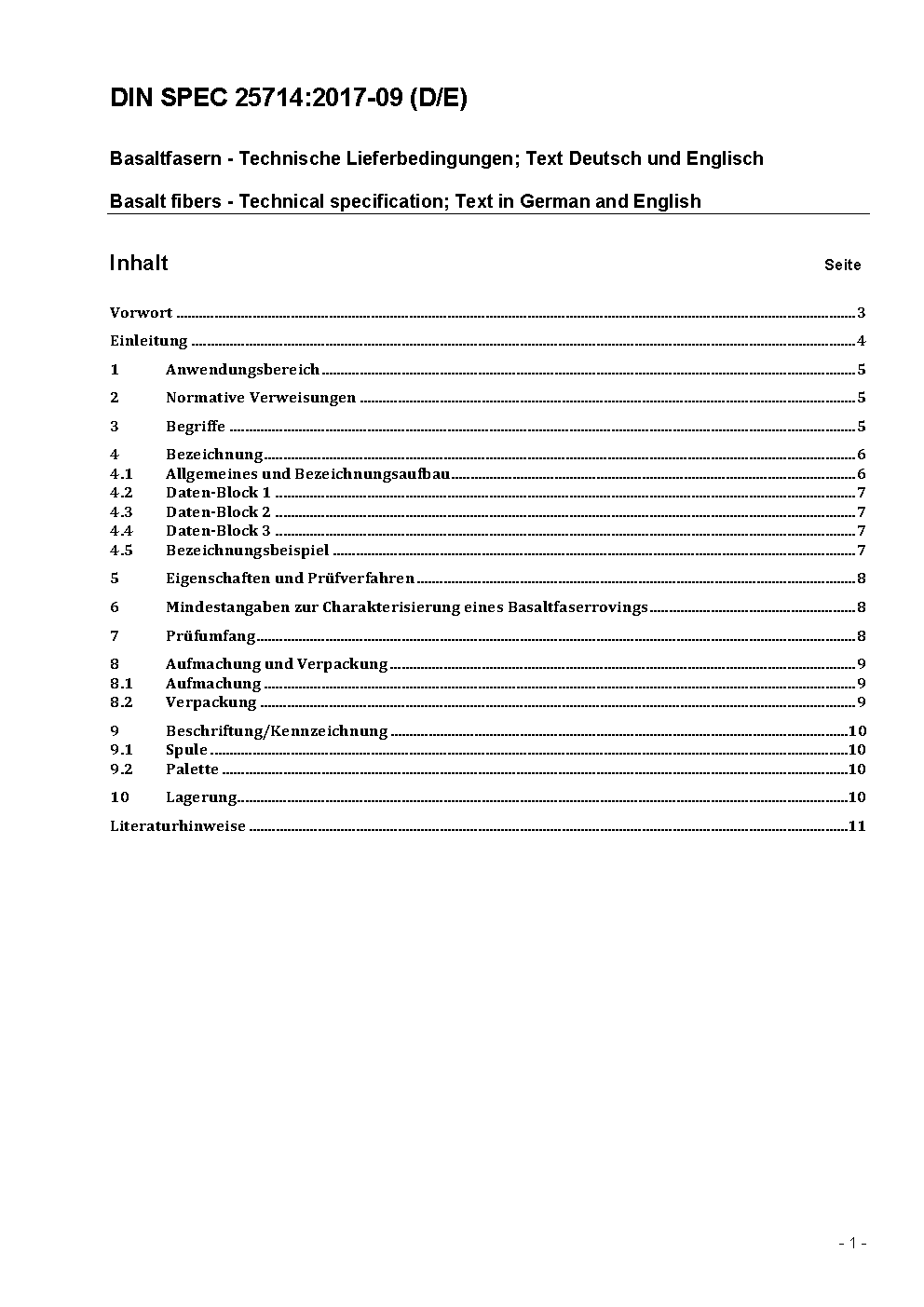 This DIN SPEC in accordance with the PAS procedure was developed within a workshop set up on a temporary basis. The document was developed and approved by authors named in the foreword. This DIN SPEC specifies a designation system, test criteria, test methods and requirements for the marking, packaging and storage of rovings that are produced from molten basalt in a (thermal) melt-spinning process and that are used in the production of textiles as reinforcing fibres for use with plastics, hydraulic dies or in other applications. Textured yarns, yarns from staple fibres and pre-impregnated rovings are not covered in this DIN SPEC.